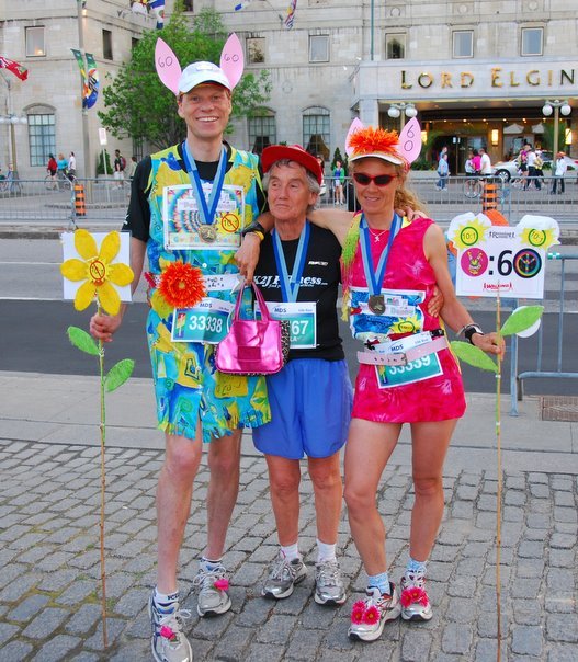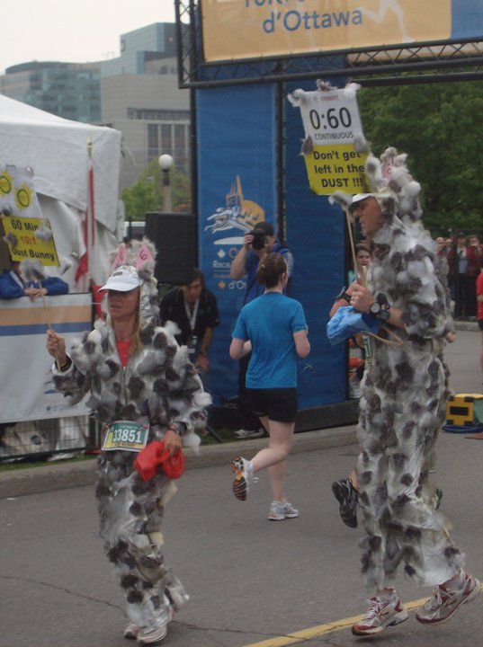 It all started quite innocently. I volunteered to be a pace bunny for Ottawa Race Weekend and when I discovered that I had to wear a shirt that was too big and a hat with ears on it, I decided If I had to look silly why not look really silly. I went to Walmart and bought a bright pink skirt, added a giant pompom for a tail and covered my shoes with bunny covers from the dollar store.