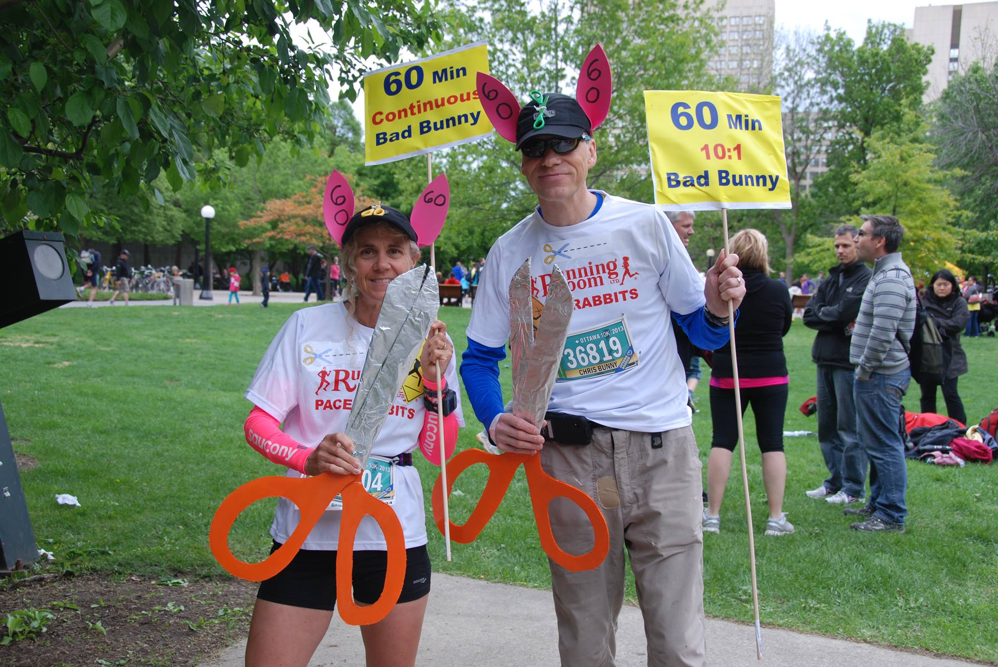 This brings us to 2013 where we appeared as the Bad bunnies who ran with scissors. On the plus side Chris made giant lightweight scissors which were easy to carry. On the downside it was difficult to negotiate a crowded run course without poking someone in the eye. I guess that’s why we were always told not to run with scissors.