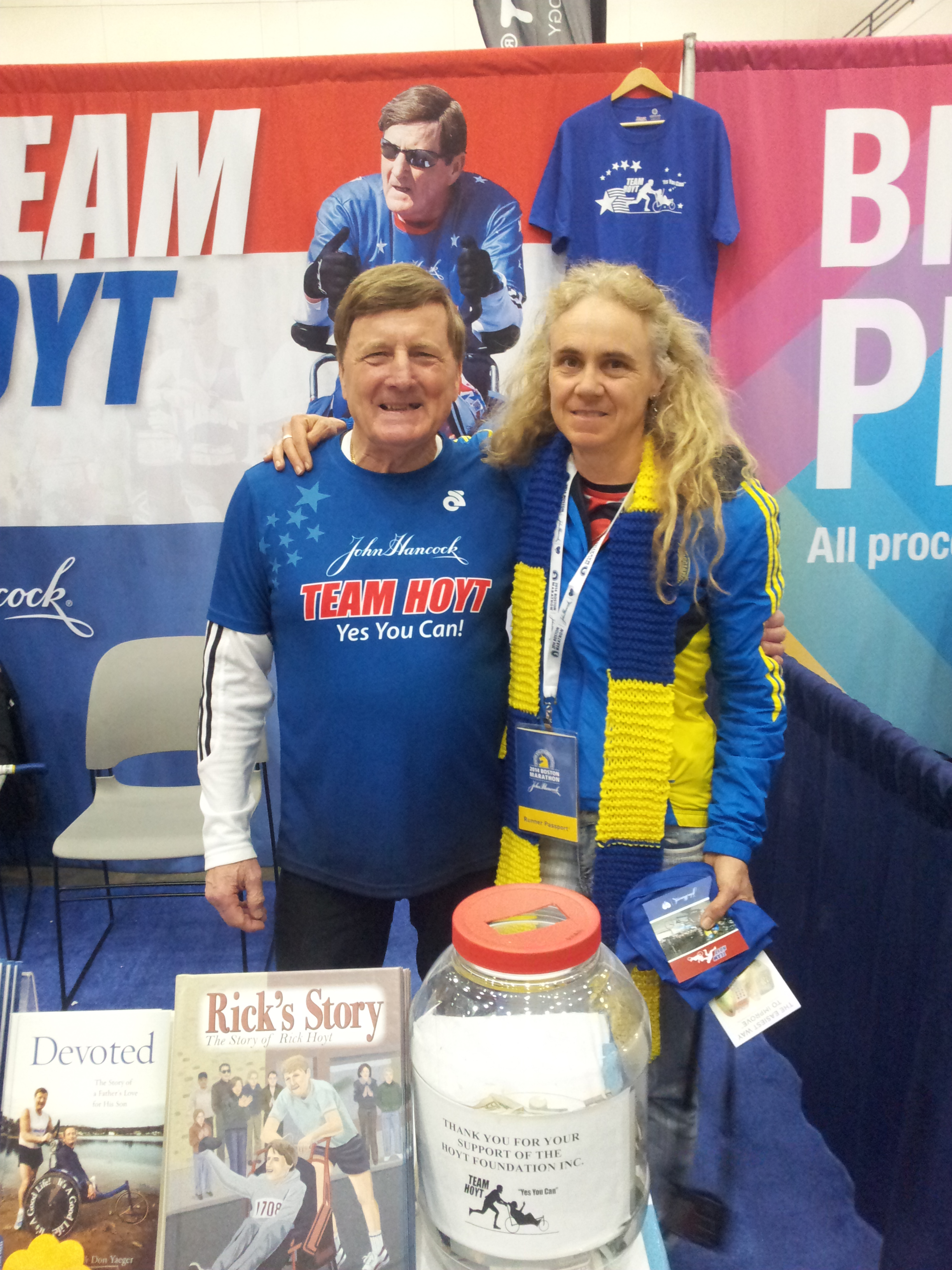 It was suggested that we post pictures with our scarves so I took mine to the expo and had my picture taken with the scarf and Dick Hoyt. Dick and Rick Hoyt have run Boston 31 times, 2013 was to be their last but they came back in 2014 to run it one more time.