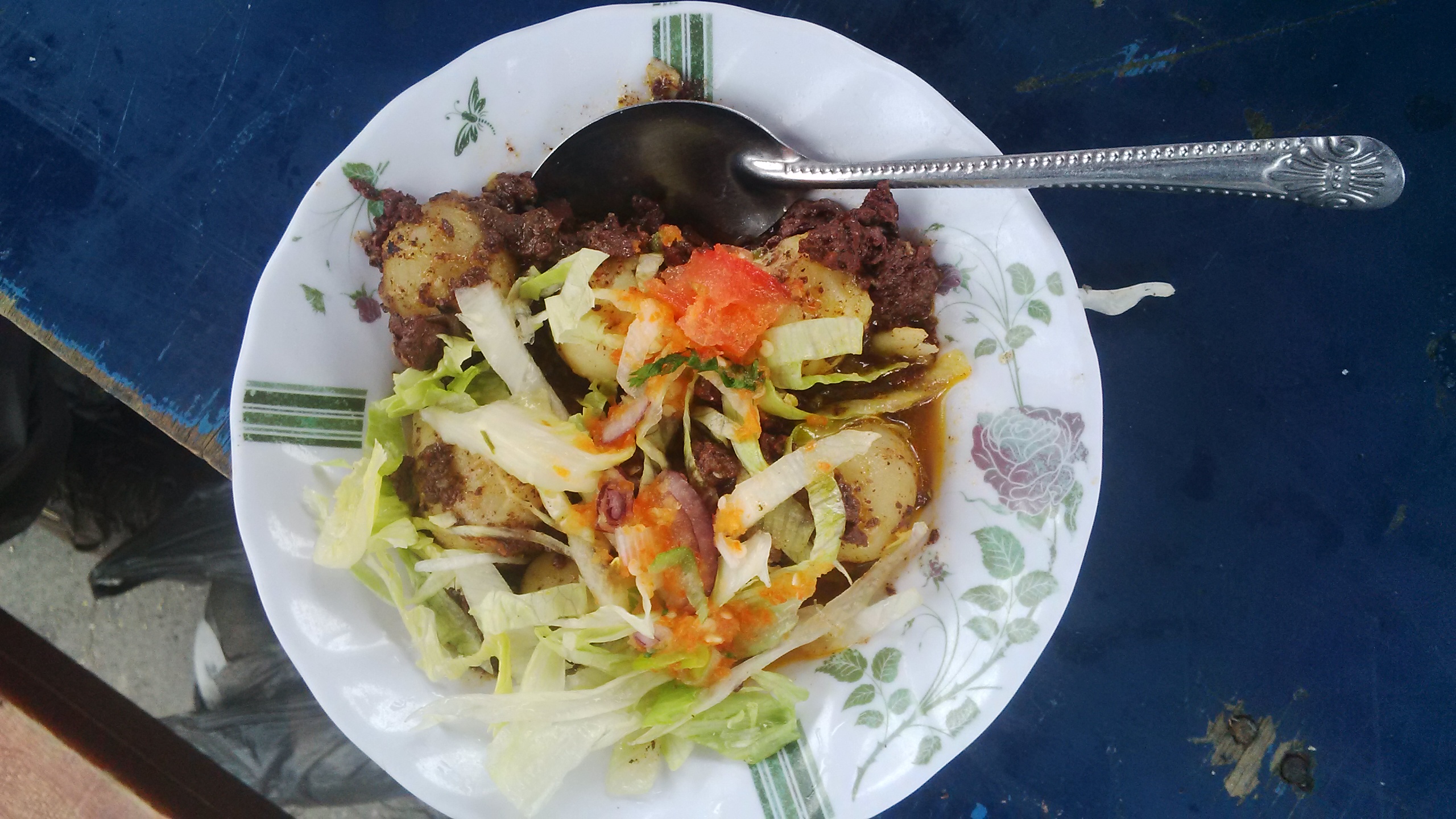 We took a chance and stopped by a lady stirring something that smelt good in a pan. For $1 each we got a bowl of new potatoes with spices and some sort of meat, with a topping of lettuce and fresh salsa. It was quite good.