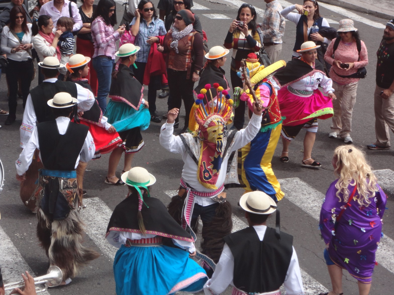 They stopped in front of the church and a group of dancers in traditional clothing joined them. They carried two litters with religious scenes up onto the church steps. The band played and the group danced. There was one man in drag and a couple of men in elaborate costumes. I have yet to figure it out but they were not doing it for money and it was obviously celebratory. The fully costumed men reminded me of Fastnacht celebrations in Germany.