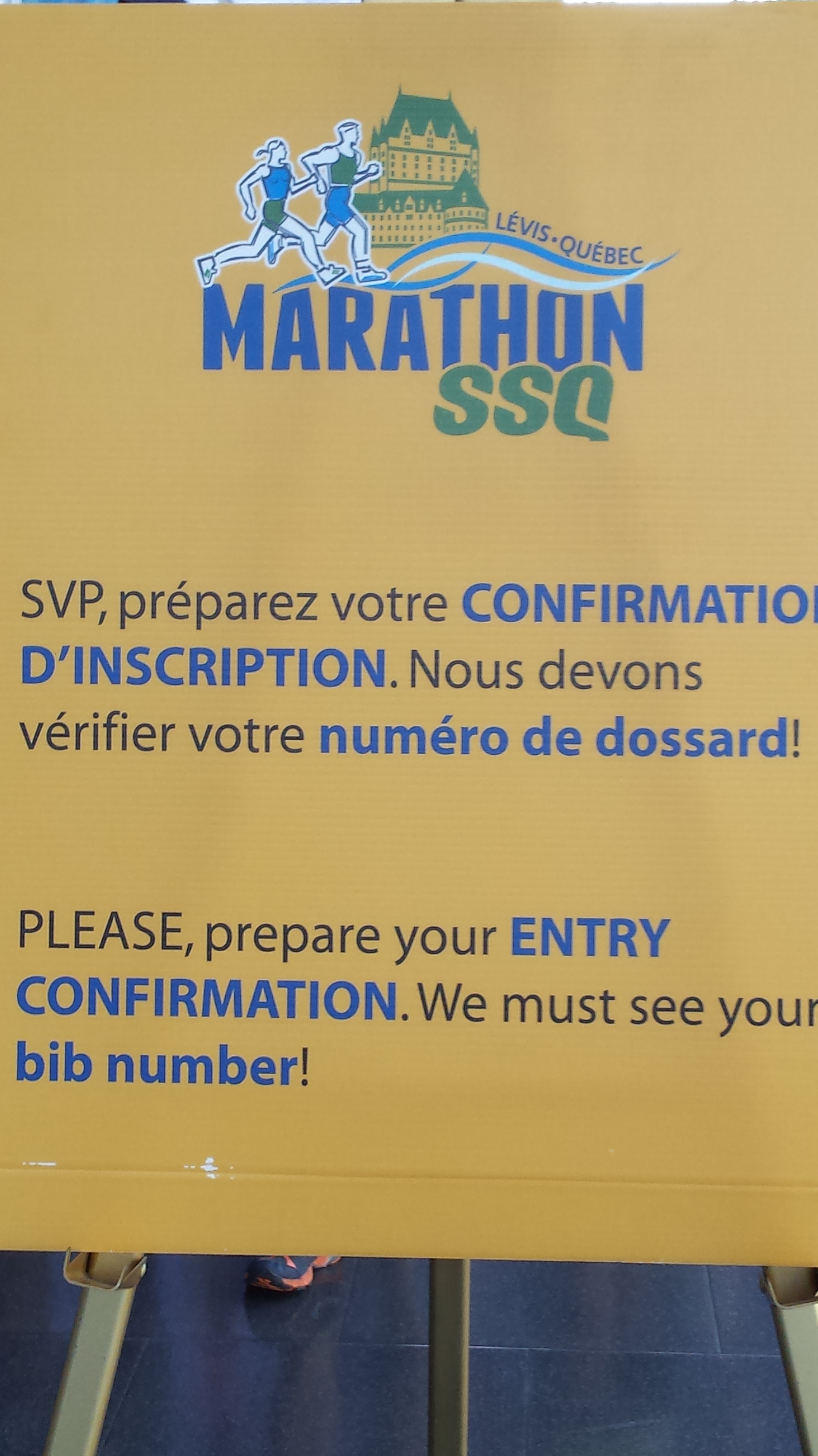 Race kit pick-up is at the Quebec Convention Centre which is an easy walk from the finish area (mostly up-hill but this was pre-race). It was a reasonable sized expo and race kit pick up is straight forward. You do need your bib number which they send via email when you register. I did not have mine but I went to the “losers who did not print the email line” they were very helpful and found my number for me.