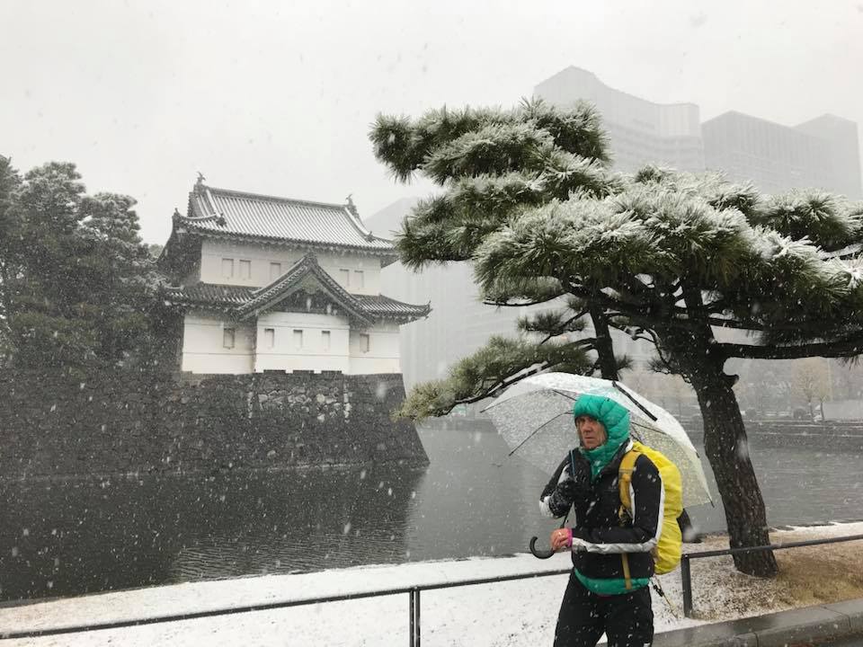 We took the train to Tokyo Station to see the imperial palace which is easy to find because it’s signposted from inside the train station. By the time we were out in the real world it was really snowing.