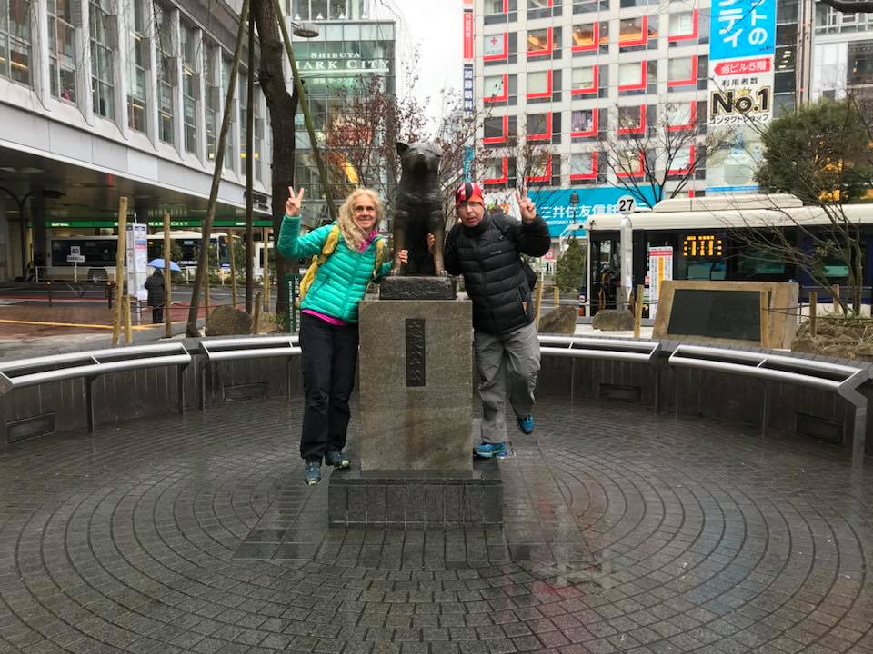 It started to rain almost as soon as we walked outside so we invested some Yen in an umbrella and made the mandatory tourist visit to Shibuya Crossing. We started with Tokyo’s most famous dog statue Hachiko. Hachiko the dog came to the station every day to meet his master and when his master died the dog continued to come to the station until he died 10 years latter. It is mandatory to get a picture with the statue and as it was cold and wet so we actually got a picture without ten other people in it. There is also a useful tourist trailer there with good maps in English. Shibuya Crossing is where you find the famous scramble crossing where thousands of people pour across the street at the same time. It’s quite a sight.