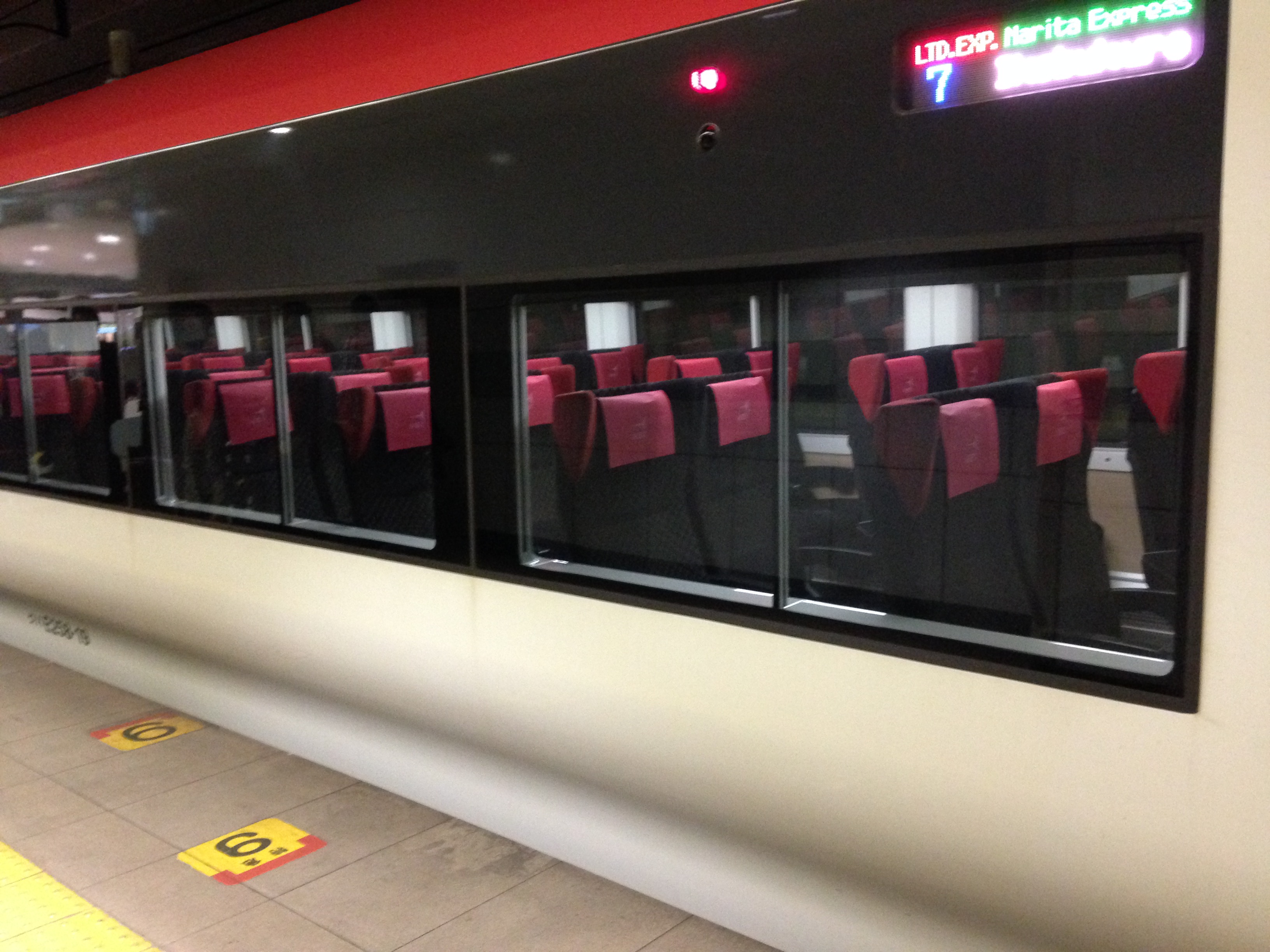 The airport is the last stop on the line so after everyone gets off they close off the doors with yellow tape, clean the cars and turn the seats around before you are allowed to get on. The train is smooth and fast and there are lots of announcements and signs in English so its easy to know when to get off the train. There is a rack on each car with locks you can use to lock up your bags but if you forget the combination you have to pick your bags up from Tokyo Station. The trains also had free wi-fi which worked but it was a bit limited. If you are going past Tokyo station the train splits and goes in two directions so it’s important to make sure you are in the correct half of the train.