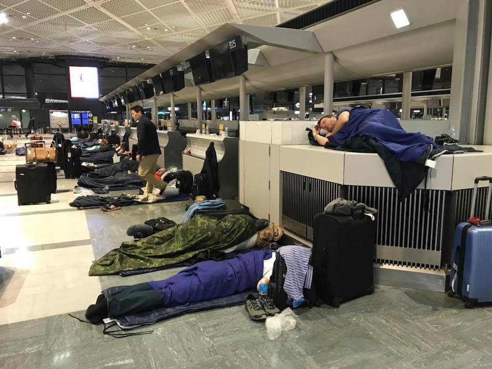Airport staff walked around the airport with signs in several languages saying there were sleeping bags available. The sleeping bags appeared to be brand new. To this day I have no idea how they came up with thousands of sleeping bags in a snowstorm.