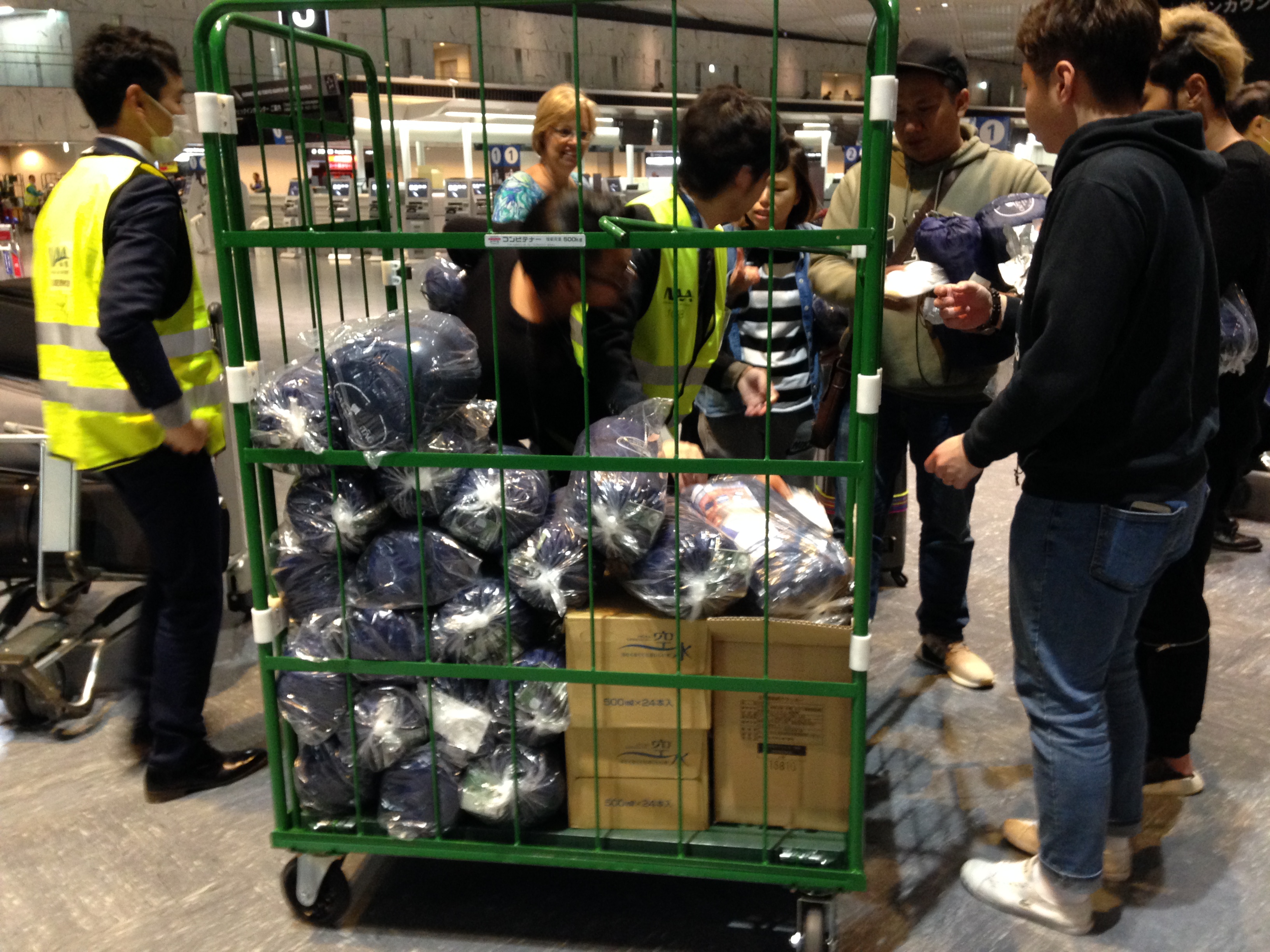 We were eventually told that we would be deplaning and going through Japanize customs and immigration. The flight was canceled and we were given a 1-800 number in the US to call to re-book a flight (more on that later). The flight crew pointed out that they were not planning on counting the pillows and blankets so we might want to take those with us. Harold had been chatting with a few of the crew. He asked if there might be a spare red wine we could take too. The response was here, take a few! Even the flight crew had no idea where they would be spending the night.