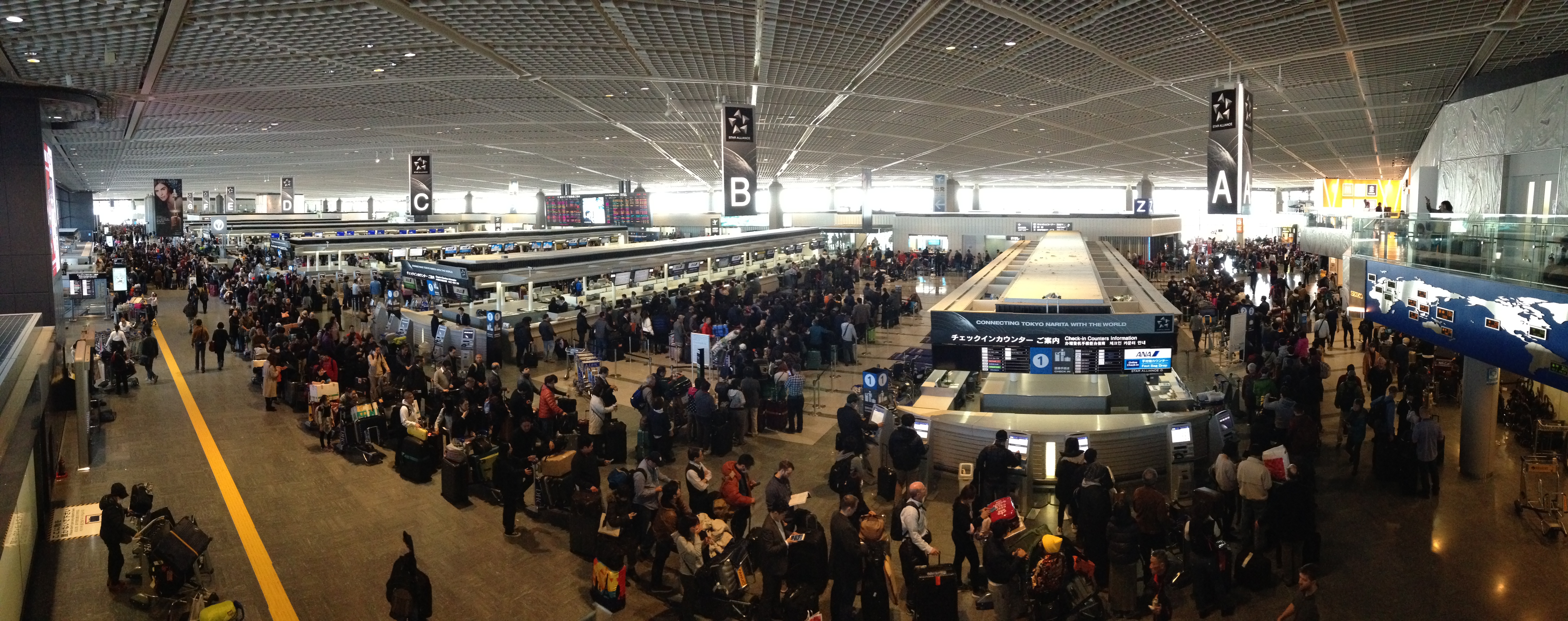 We had tickets booked so I thought lets try the check in machines. We could confirm the tickets and wait a few hours to get rid of the bags. The third or fourth machine I tried actually worked and when I pulled up the reservation it asked if we wanted to confirm it or change it. One of the options was to delay our return flight to the next day. At this point we had spent one night on a plane and a second night on the airport floor. It was an overnight flight home and we would be spending the next 6 hours in line. We decided that no one really needed us home that badly. So we booked a hotel in Tokyo for the night and changed the tickets. It was not a factor at the time but we actually got a refund on the hotel ,meals and train fare through the travel insurance on our credit cards.