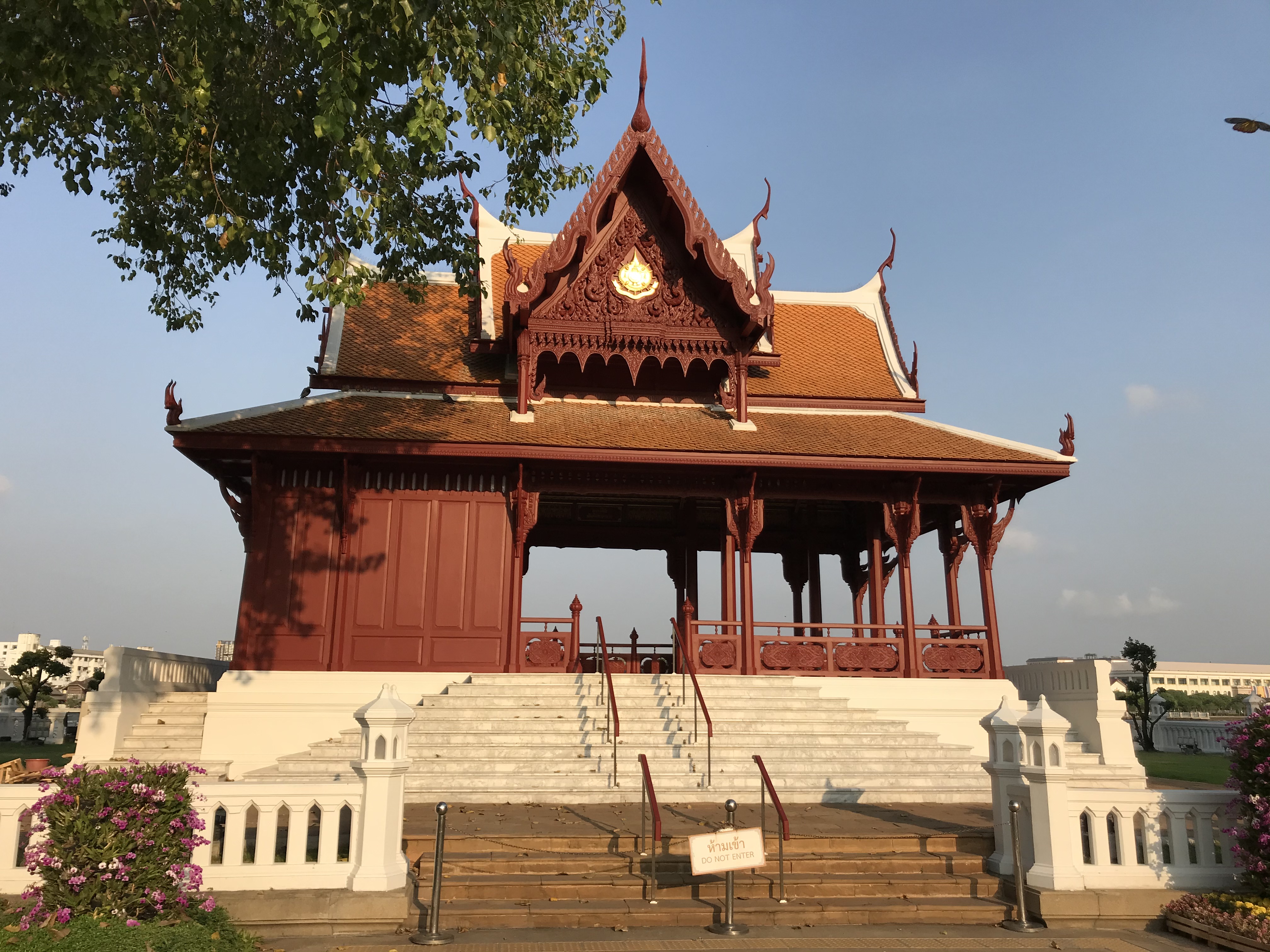There is a shortcut through the fence which brings you to a 200 year old tree from there we continued on to Wat Chana Songkhram (an 18th century royal temple) the monks were praying and people were stopping by for a quick prayer on their way to work. There is a school across the street and the kids were rushing in. Kids at schools in Thailand all wear uniforms so they are easy to spot.