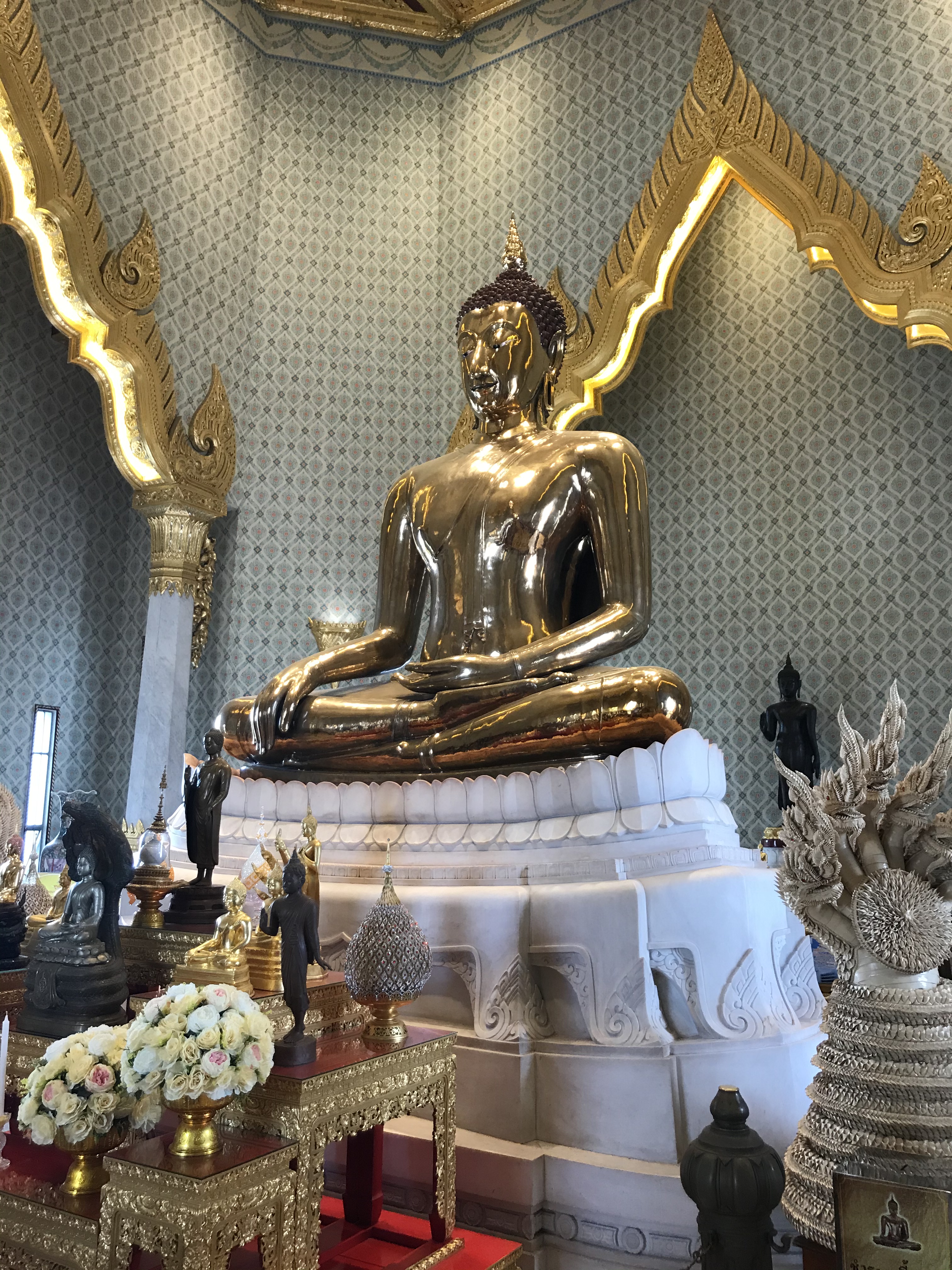 We arrived at Wat Traimit home of the famous Golden Buddha. It is the world’s largest solid-gold Buddha, over 3m tall weighing 5 ½ tons. It was cast in the 13th century and covered in stucco when it was transported to Bangkok to keep it safe from thieves. It was so well concealed that, until 1955 when it was chipped during transport to it’s current location, no one knew it was gold underneath the stucco.  It’s a very popular tourist attraction and the area around it was jammed with minivans full of tourists trying to get around each other.