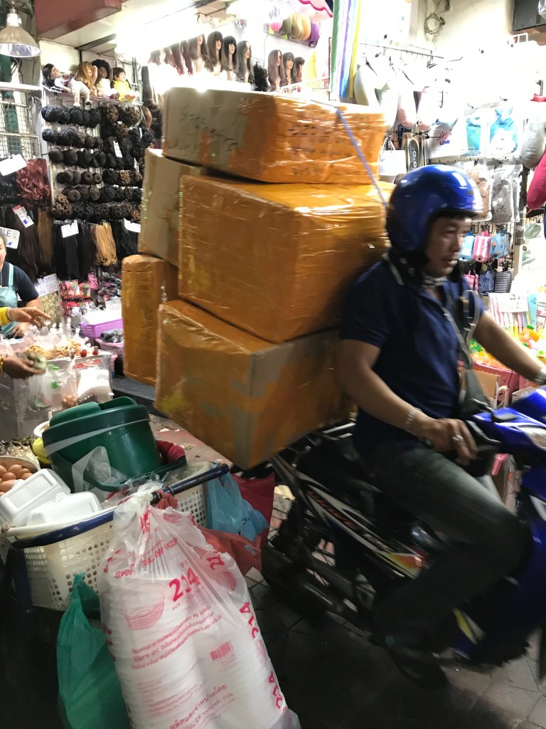 It was hot so we went looking for fruit shake #2 of the day. We walked up Ratchawong road which is full of small shops selling the novelty items you see sold in tourist sites in bulk. We went into Pahural Market which is a cross between a street market and a shopping mall. Small stores some of which are quite modern connected by a series of alleys jam packed full of people on foot with the occasional scooter or delivery cart thrown in. You literally have to move with the crowd.