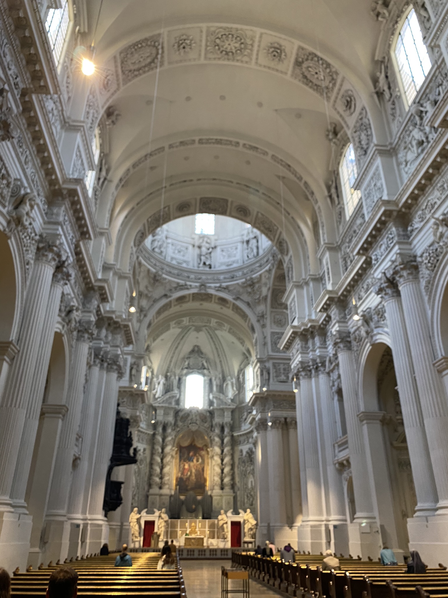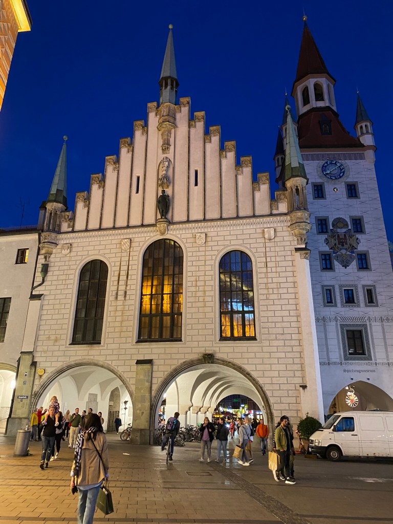 We spent two nights in Munich. We stayed at the B&B Hotel Munchen-Hbf which is about 1.5 km walk from the train station and less than 2 km from the old city so we walked everywhere. The rooms are basic but clean and the breakfast is a buffet of all the things you expect from a German breakfast: Buns, cheese, sliced meats, jam, cereal and yogurt. They seemed very busy when we were there. One woman was trying to keep everything filled up and they were running out of everything, but it was a Sunday when everything else was closed so maybe it was extra busy. We went for a walk the first night and discovered St Peter’s church right at the end of the street.