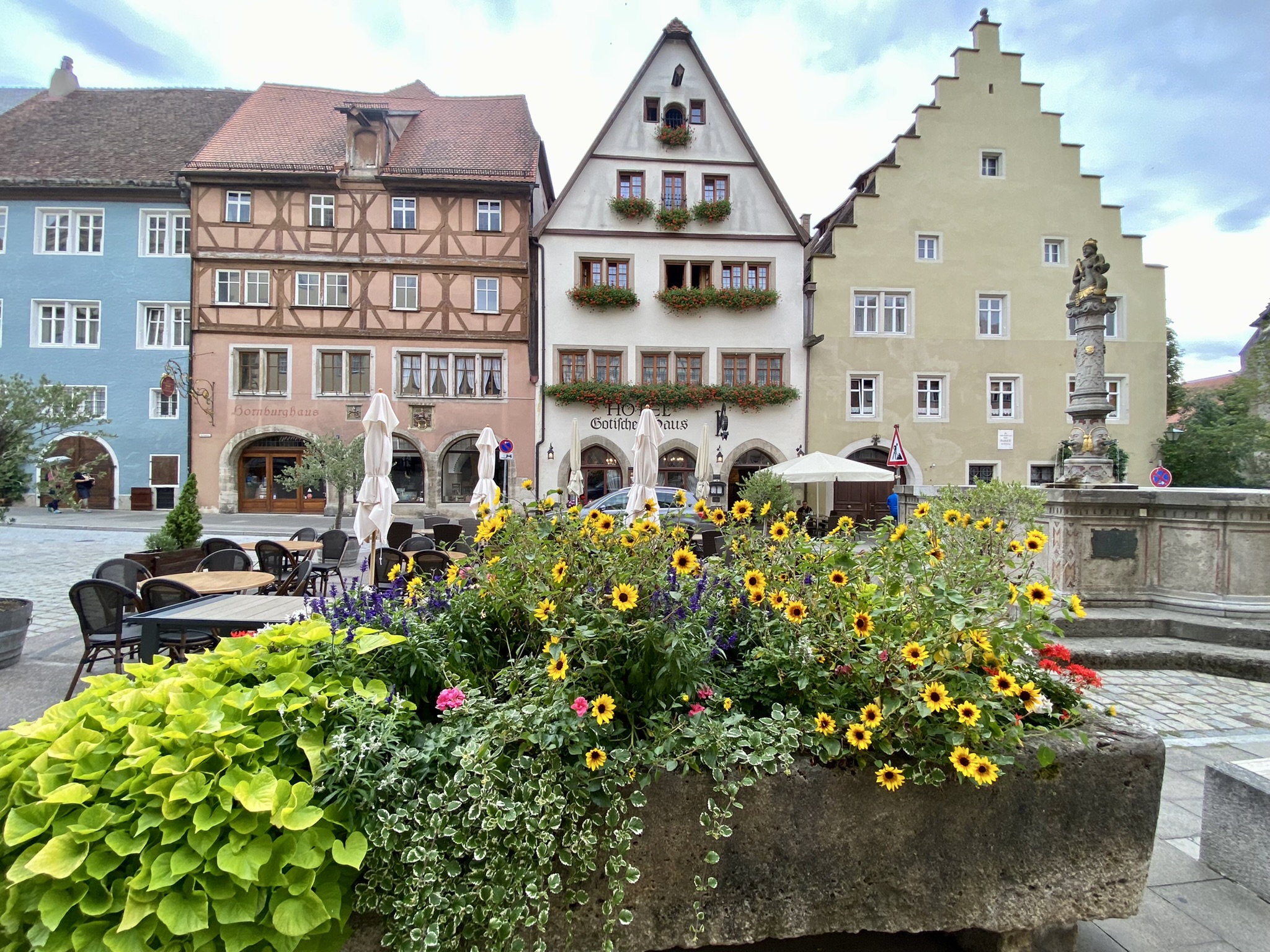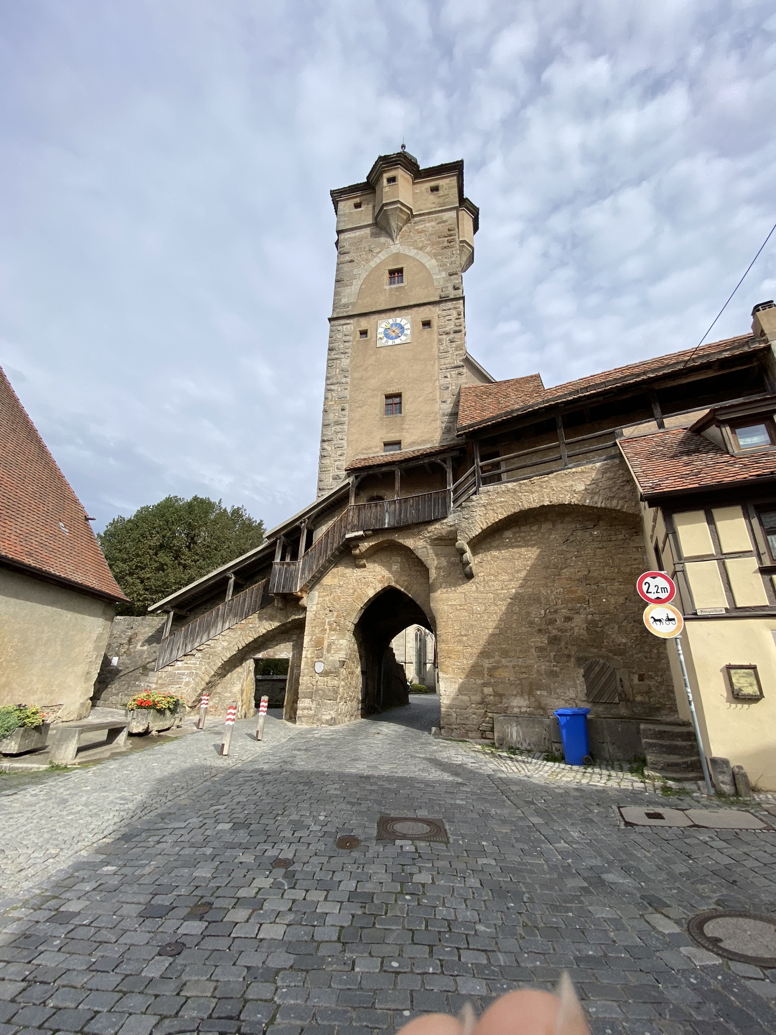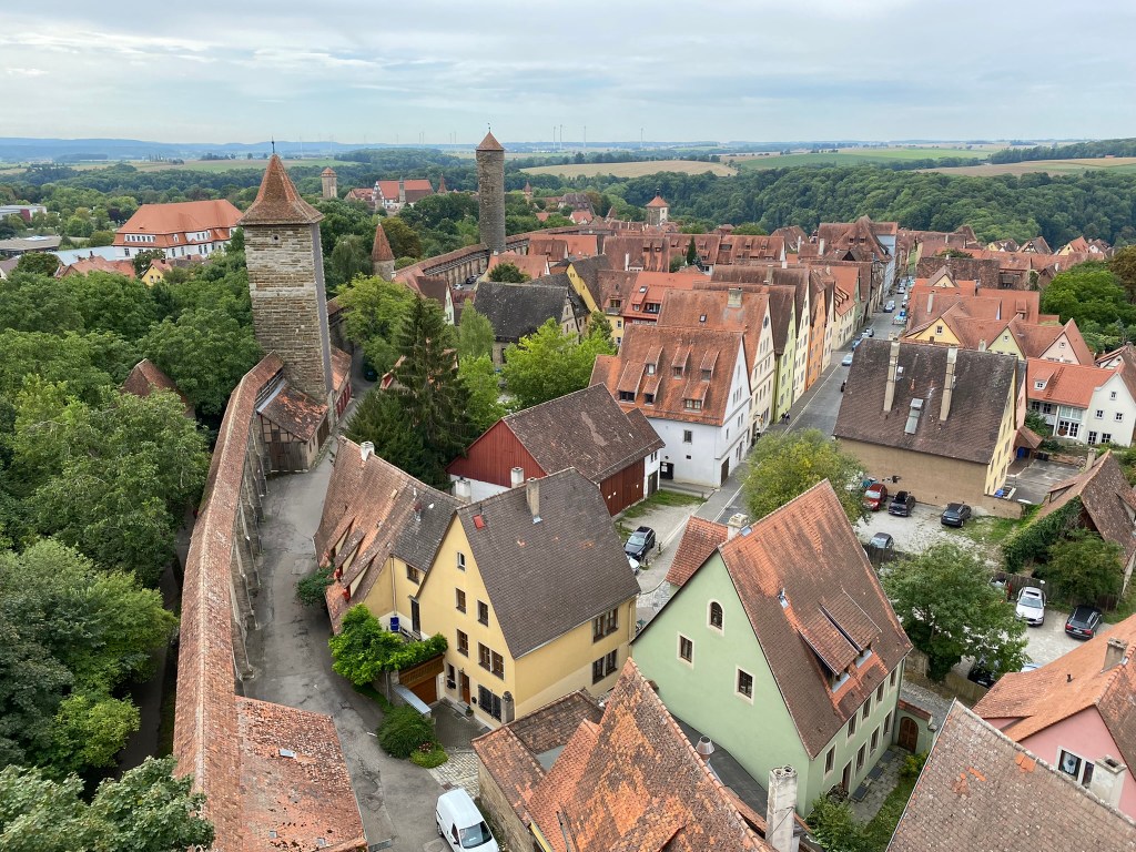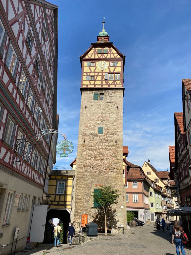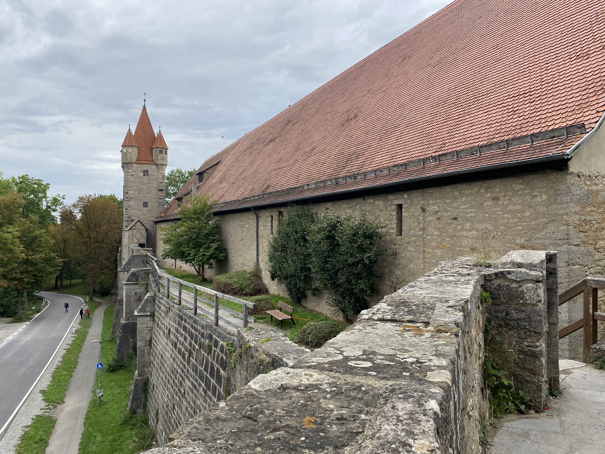 In Rothenburg ob der Tauber (literally translated to Rothenburg on the Tauber which is the river which flows by it) we stayed within the old city wall at Freud Pension. It’s just inside the city walls. The room was basic and clean and a traditional German breakfast of buns, cheese and wurst with yogurt was included. We chatted with our host in a combination of German and English. The pension was right across the street from one of the town churches and we could hear the church bells and the organ from our room. We loved it, but our host shared that during the lock down the organist would often spend all day playing and it got to be a bit too much. There were lots of tourists in Rothenburg, but it is obvious that they are set up for many more. We were told that in general the tourists are back, but the Chinese are not allowed to travel and that is still having a big impact. Like Canada Germany was locked down for several months and although the government provided help as they did in Canada the tourist businesses are still struggling.