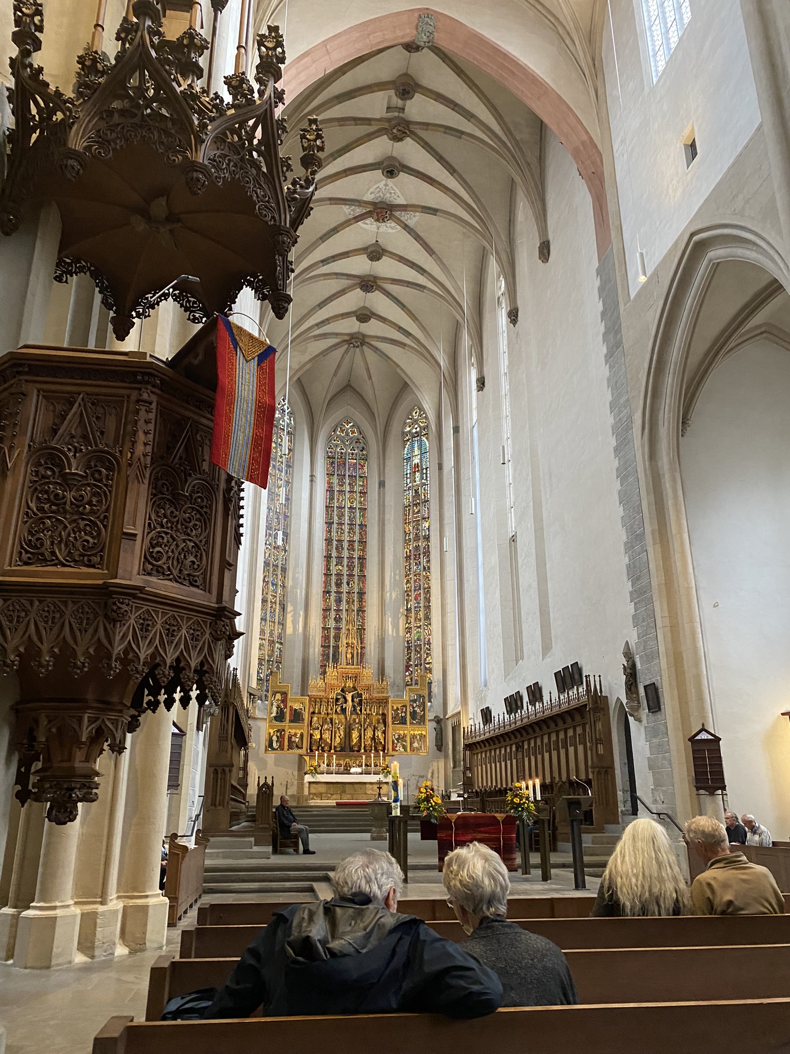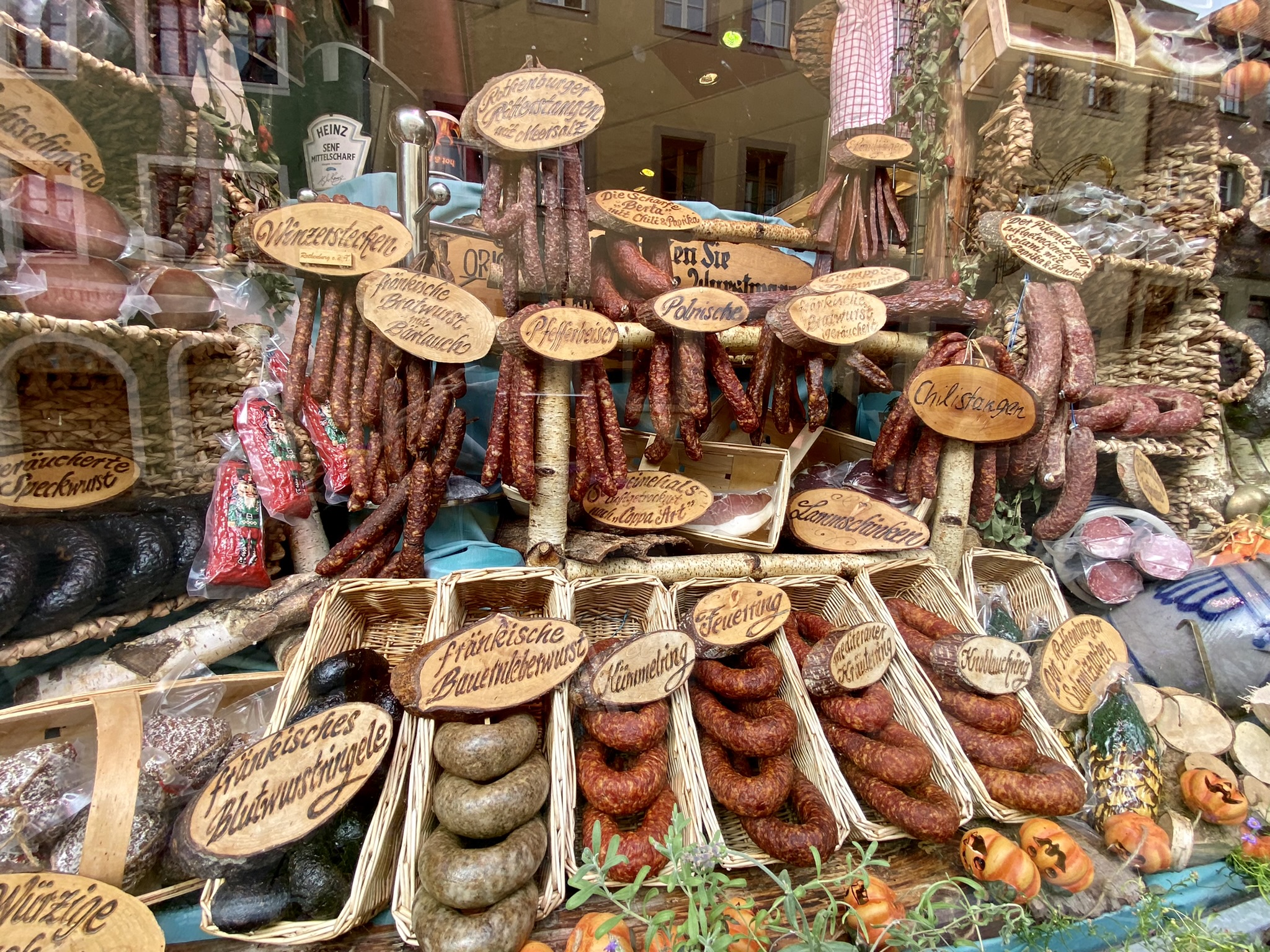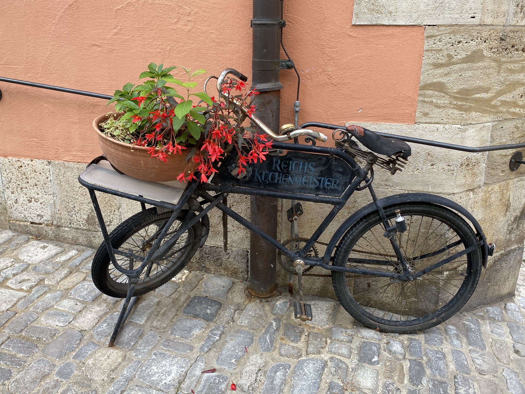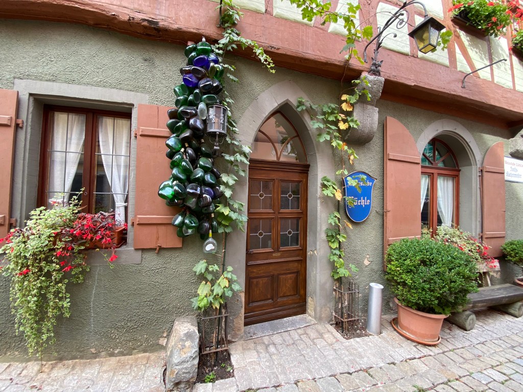 In Rothenburg ob der Tauber (literally translated to Rothenburg on the Tauber which is the river which flows by it) we stayed within the old city wall at Freud Pension. It’s just inside the city walls. The room was basic and clean and a traditional German breakfast of buns, cheese and wurst with yogurt was included. We chatted with our host in a combination of German and English. The pension was right across the street from one of the town churches and we could hear the church bells and the organ from our room. We loved it, but our host shared that during the lock down the organist would often spend all day playing and it got to be a bit too much. There were lots of tourists in Rothenburg, but it is obvious that they are set up for many more. We were told that in general the tourists are back, but the Chinese are not allowed to travel and that is still having a big impact. Like Canada Germany was locked down for several months and although the government provided help as they did in Canada the tourist businesses are still struggling.