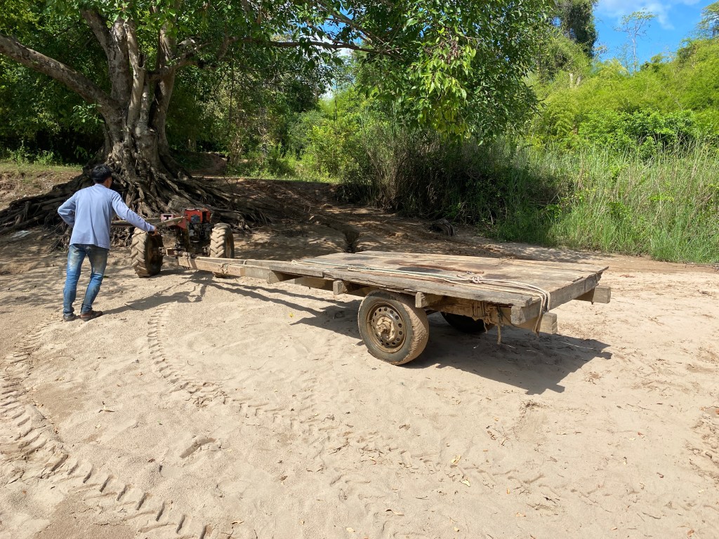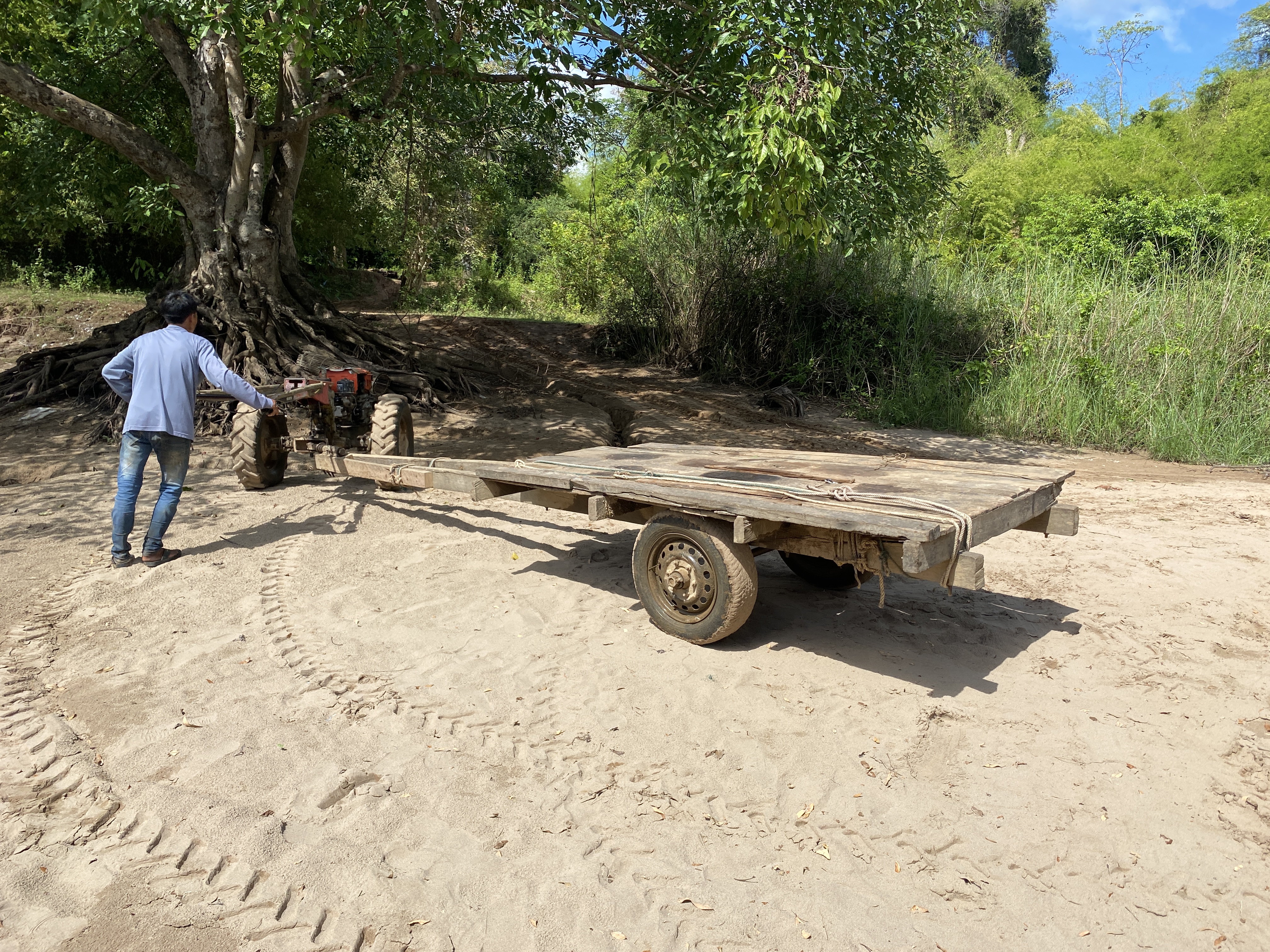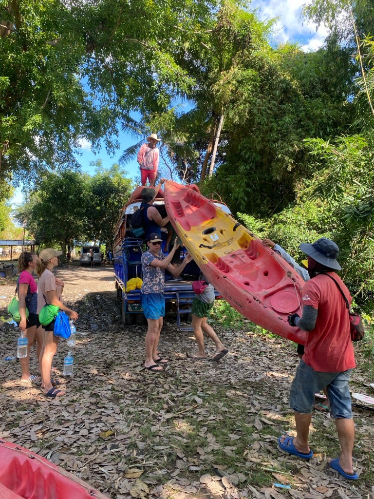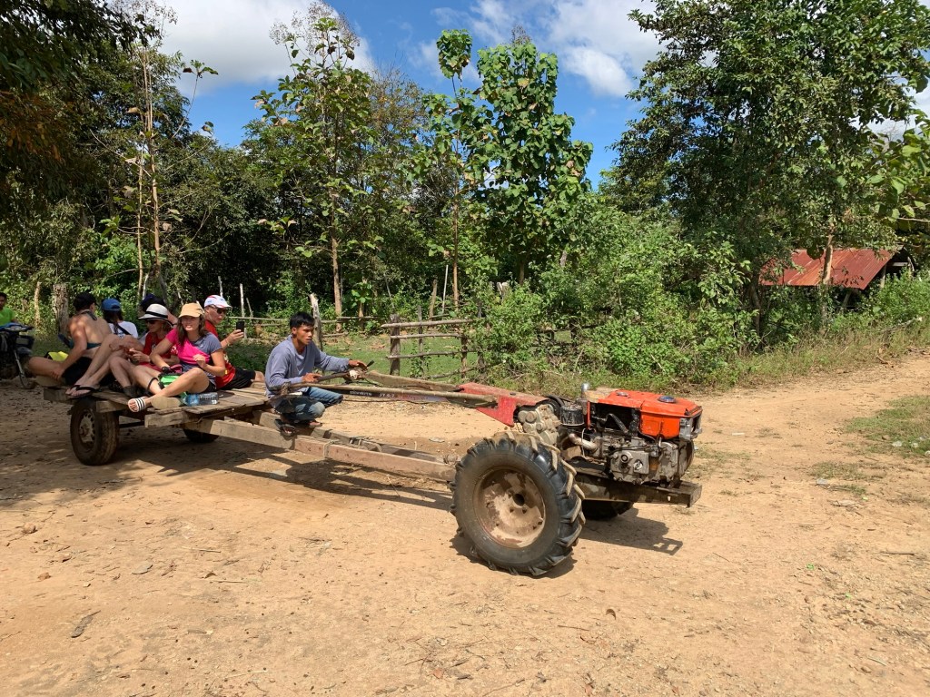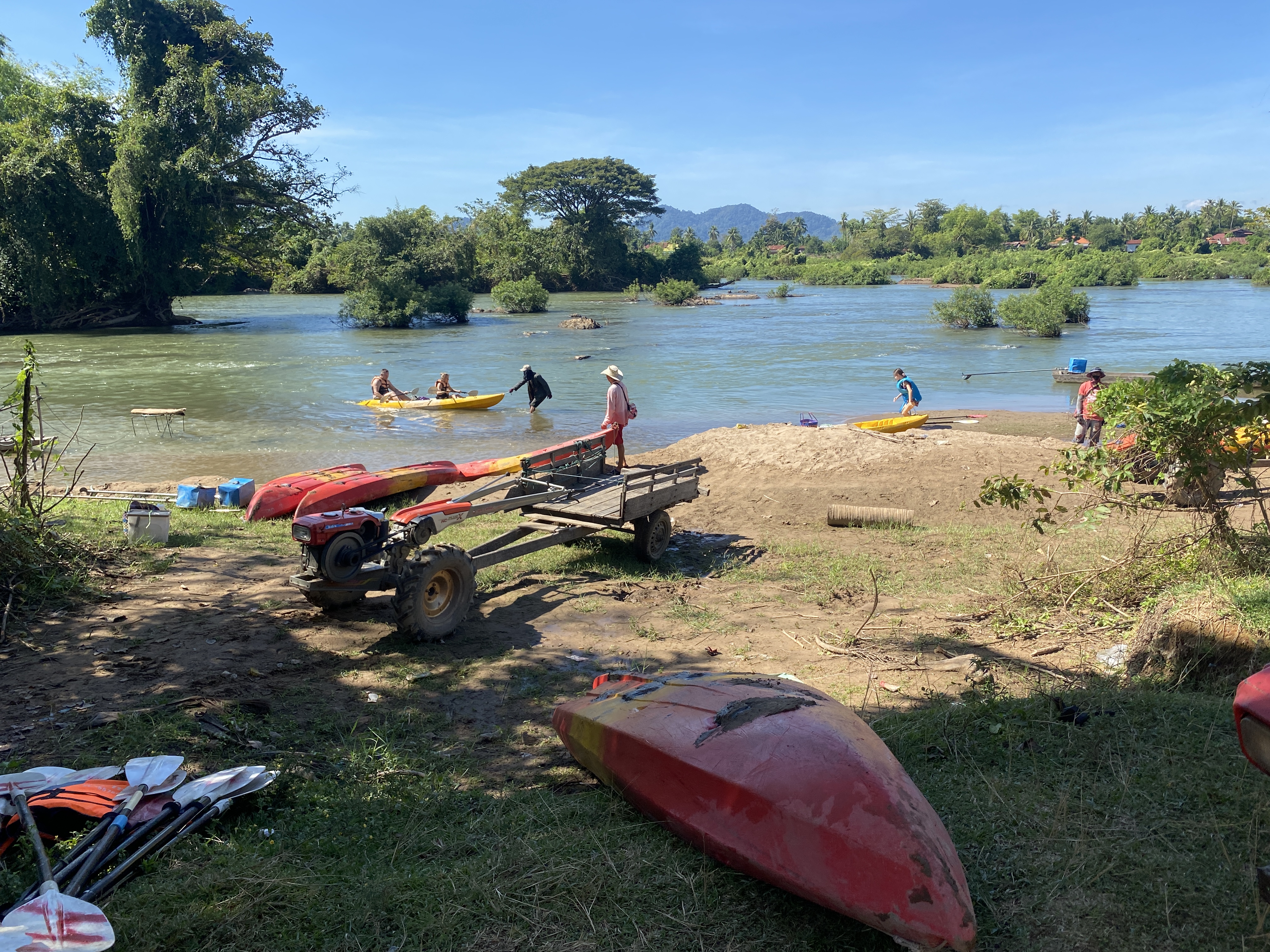 We then Kayaked down to an unknown island which I believe was Don Som. The water is pretty fast moving but the kayaking was easy. When we landed Mr Lek paid a fee (part of which appeared to be cigarettes) to a couple of local guys who loaded the kayaks onto traditional tractor wagons and took them across the island.