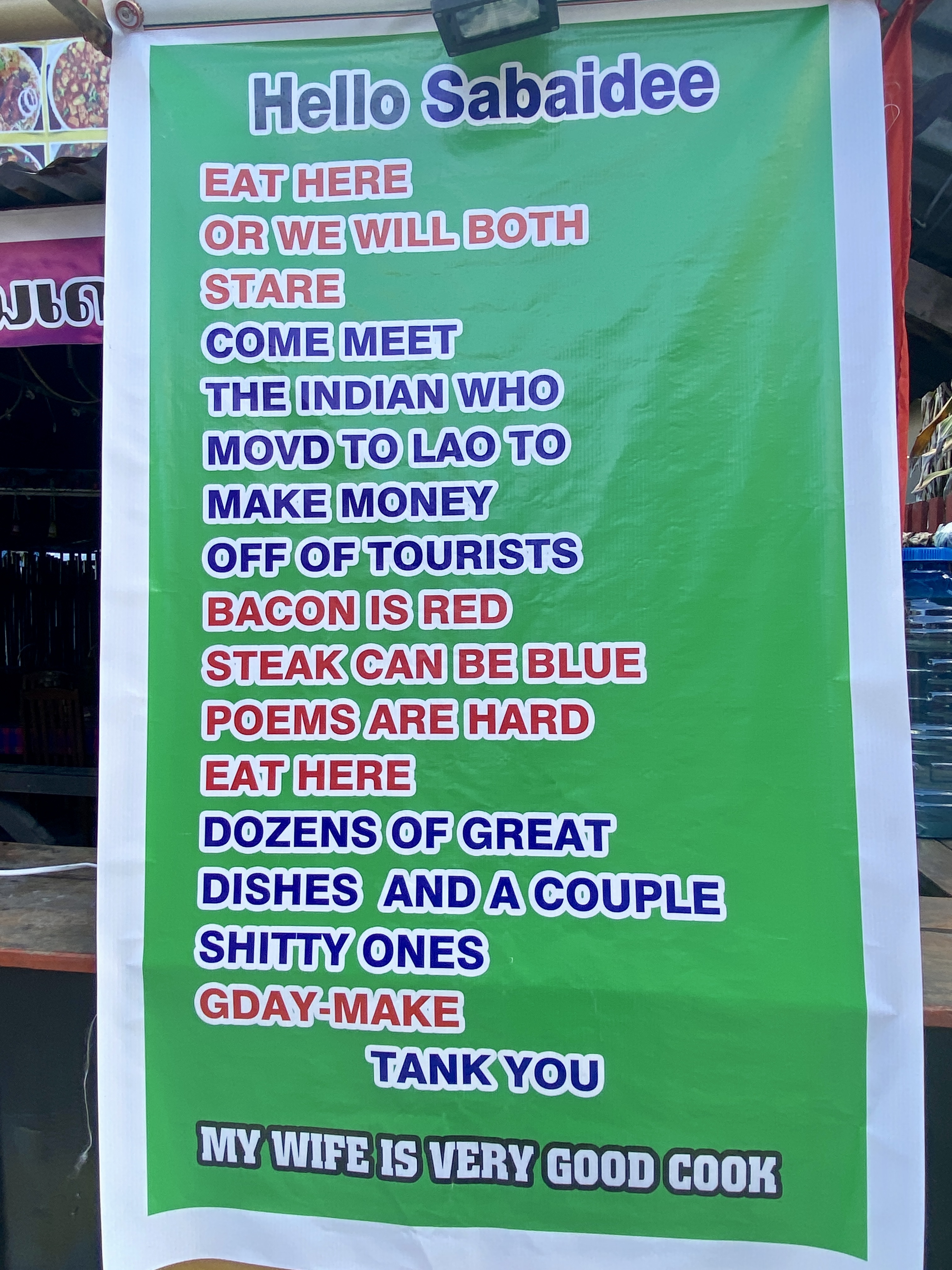 Life on Don Det and Don Kong is very laid back. At most restaurants a simple meal took an hour. When you sit down they give you the wifi password and take your order. No one is in a hurry. Hanging out is the norm. Many restaurants have “Happy Shakes, Happy Pizzas and other Happy items”. Although cannabis is illegal in Laos. Happy foods may have that or other ingredients. We did not try any happy food.