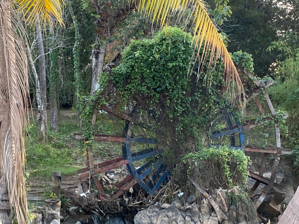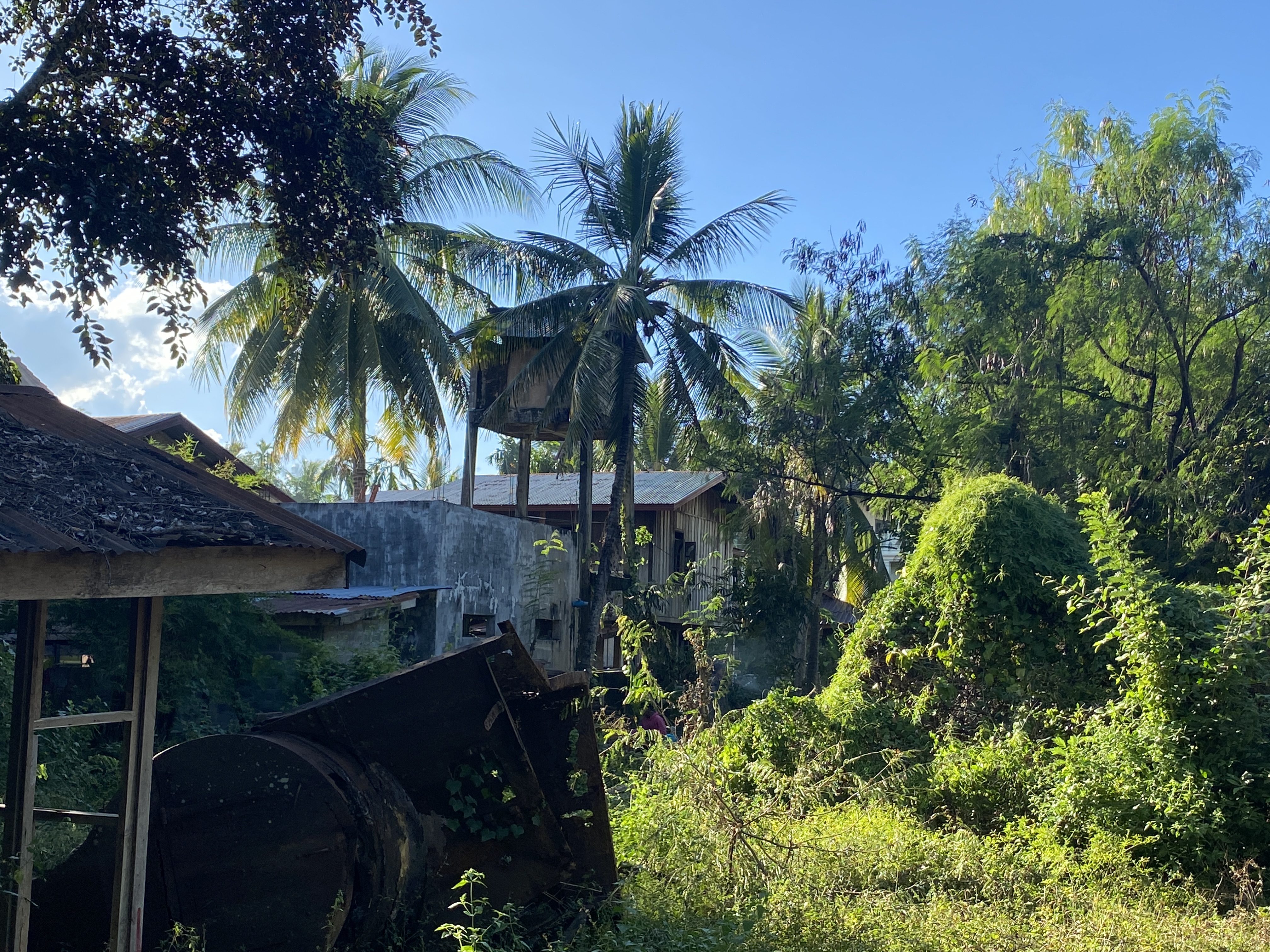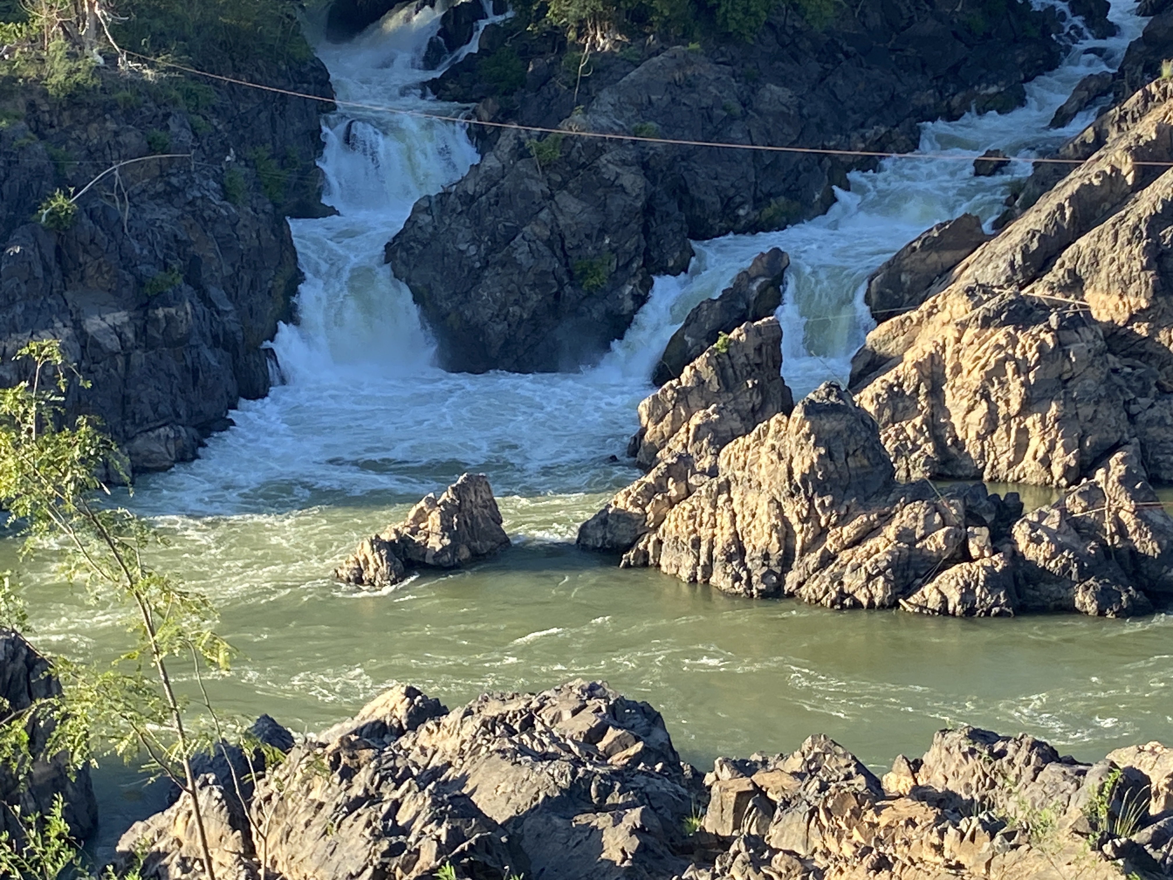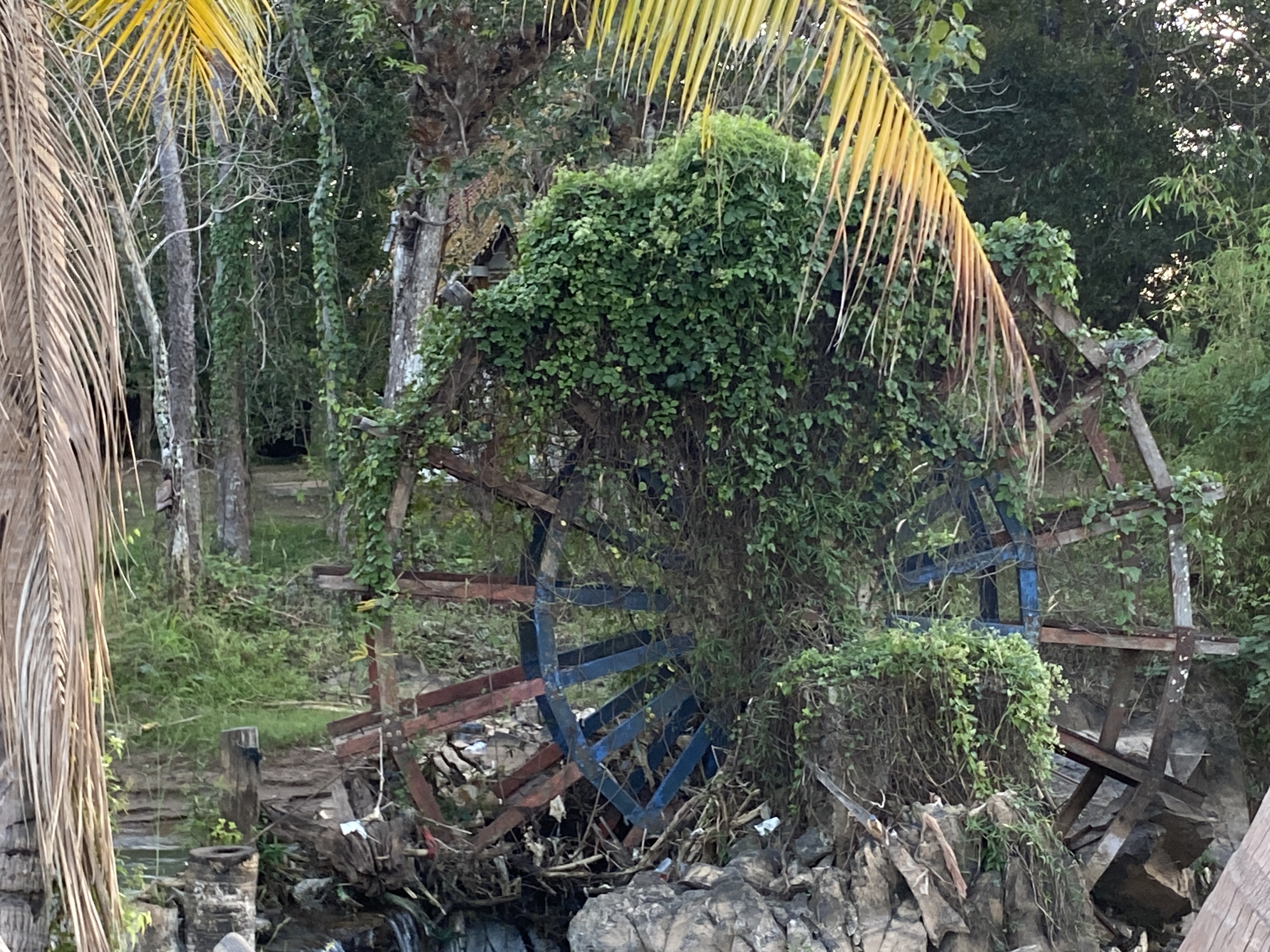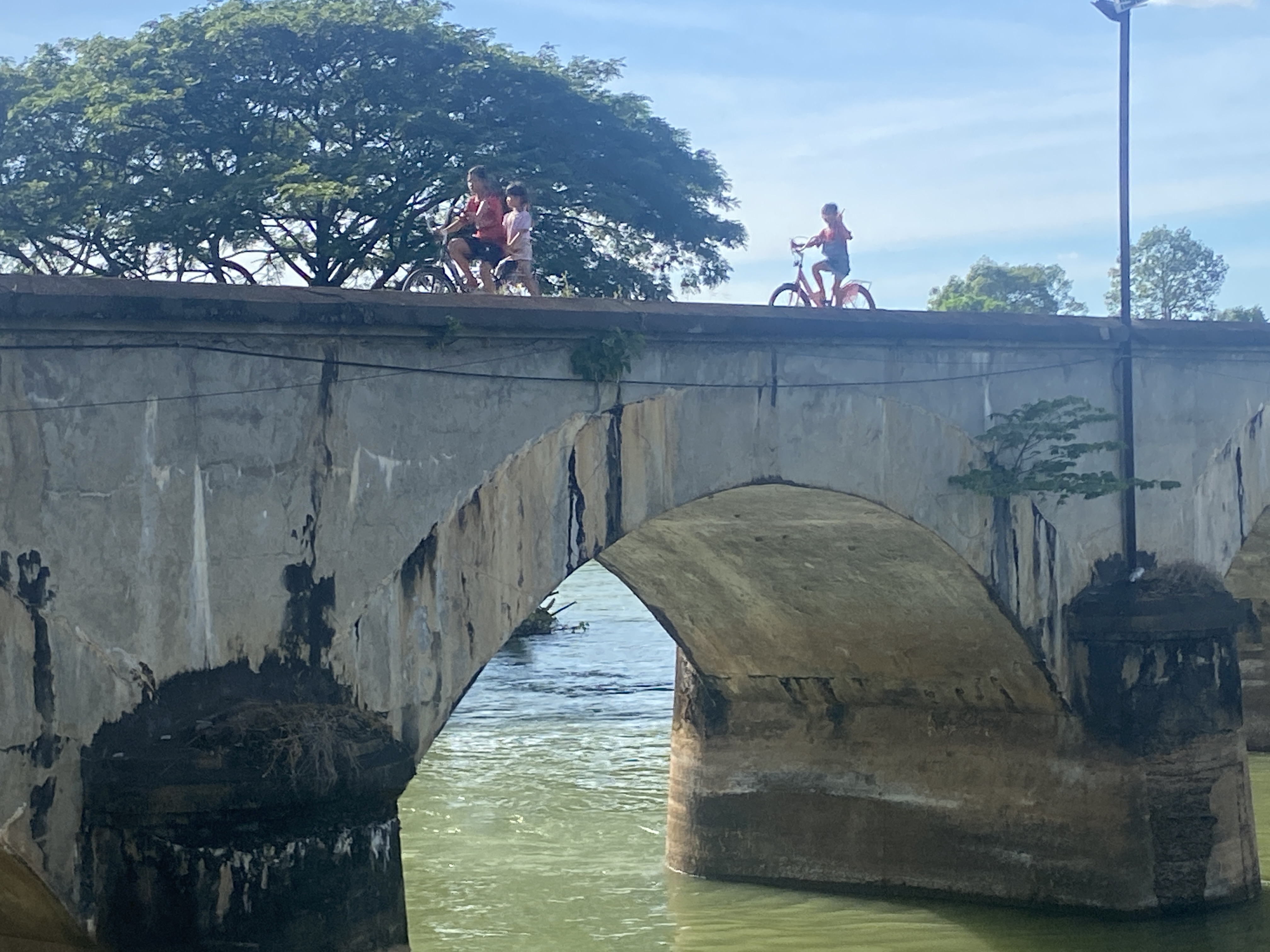 The Old French Port at the southern end of the Island was once the hopping off point for seeing Irrawaddy dolphins, but the last one in Laos died in 2022. There is a small population left in Cambodia (89 in 2020). You can see Cambodia from the old french port it’s right across the river. We stopped there for a fruit shake in a restaurant overlooking Cambodia. There is a small display with an engine and an explanation about the railway in English. There were four small boys playing in it. They were trying to hook a bicycle to a wheelbarrow full of kids. It did not work.