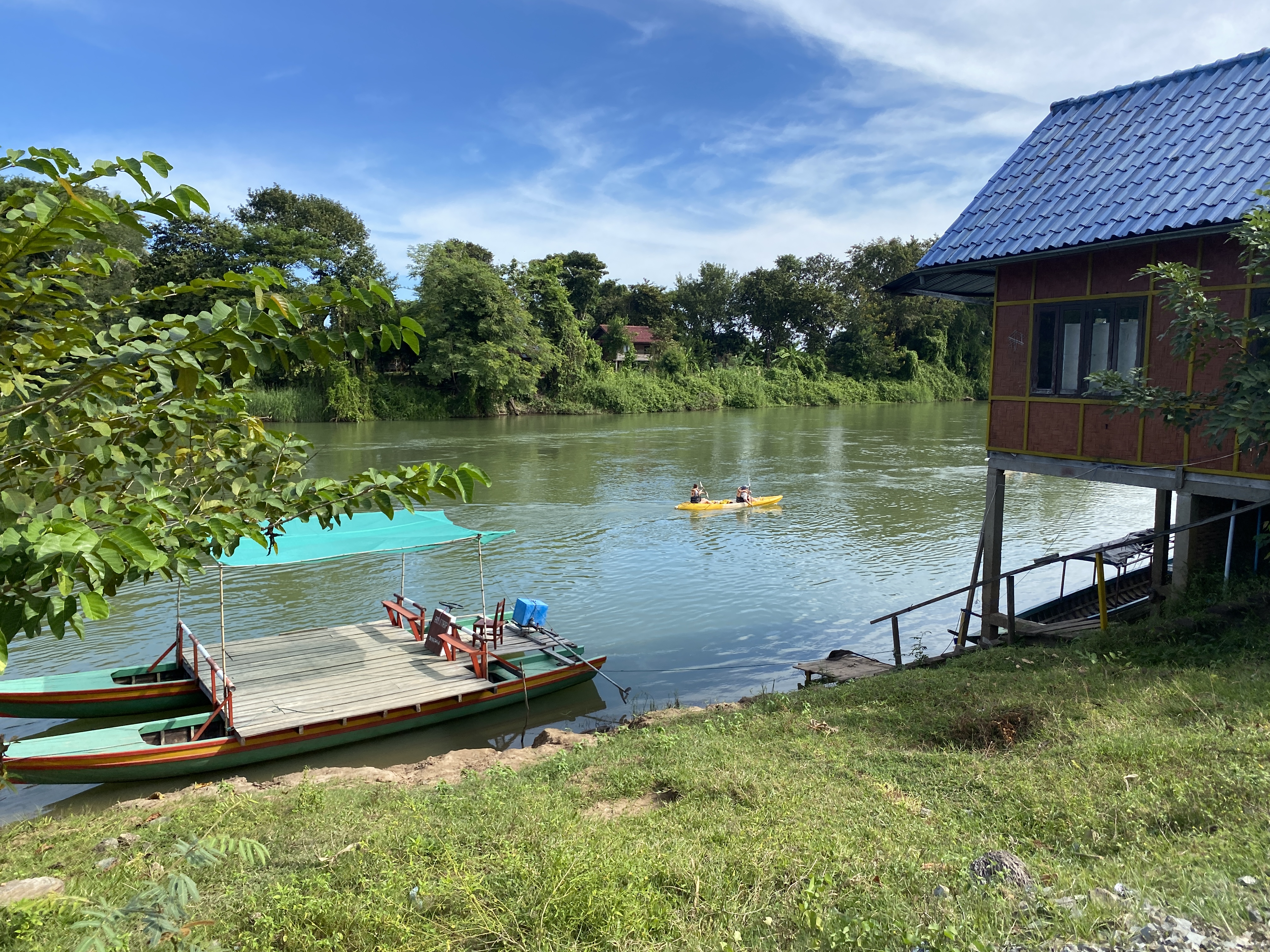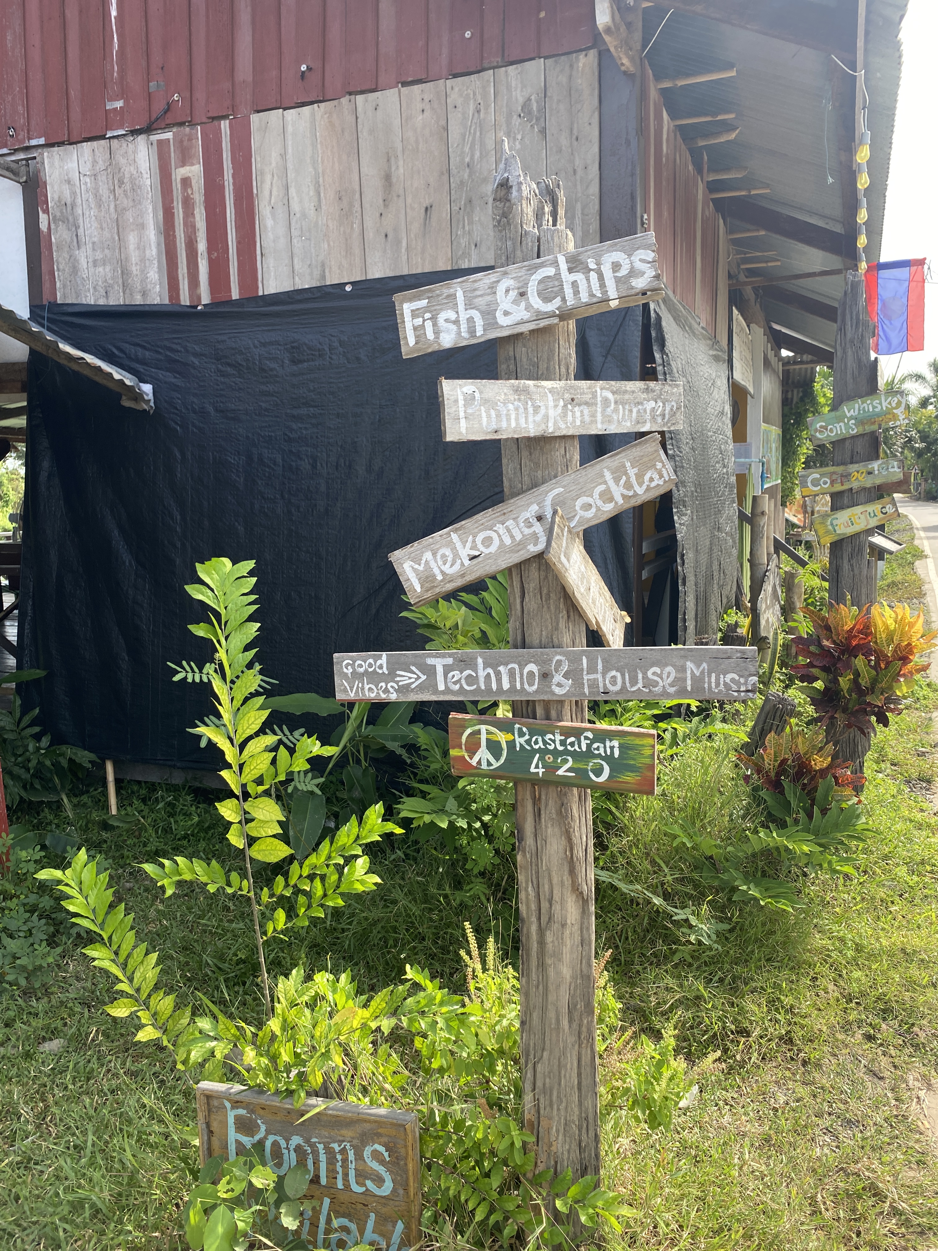 We had booked a hut at Ois Place but the owner’s mother passed away and they asked us to  cancel our booking. It looked nice from the outside. We ended up a bit further down in a very basic hut (fan and a single light bulb) with two hammocks on the front porch for about $10 a night. There was a restaurant/ bar area overlooking the Mekong which we were also free to use.