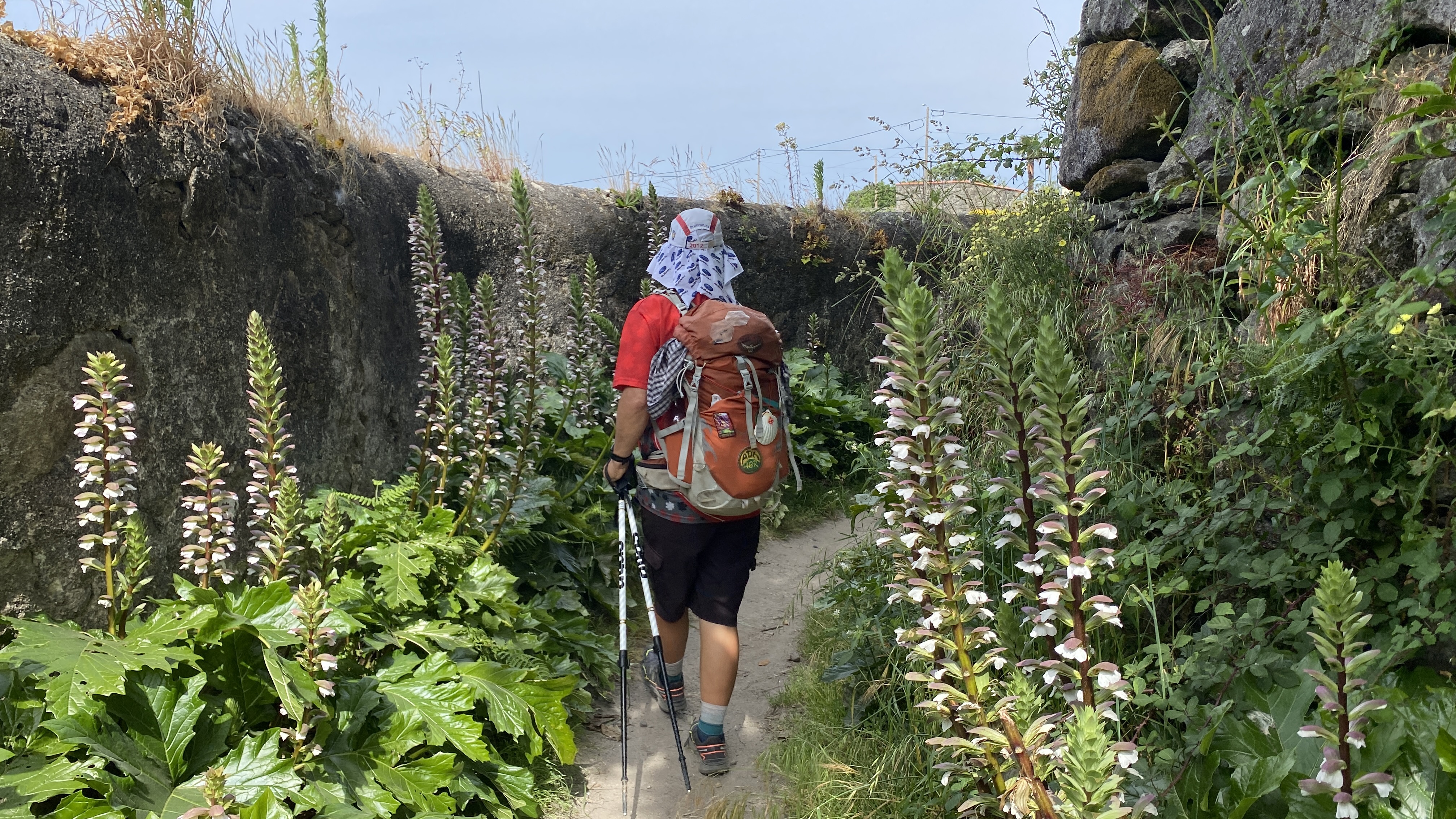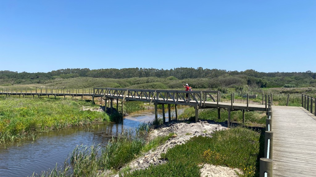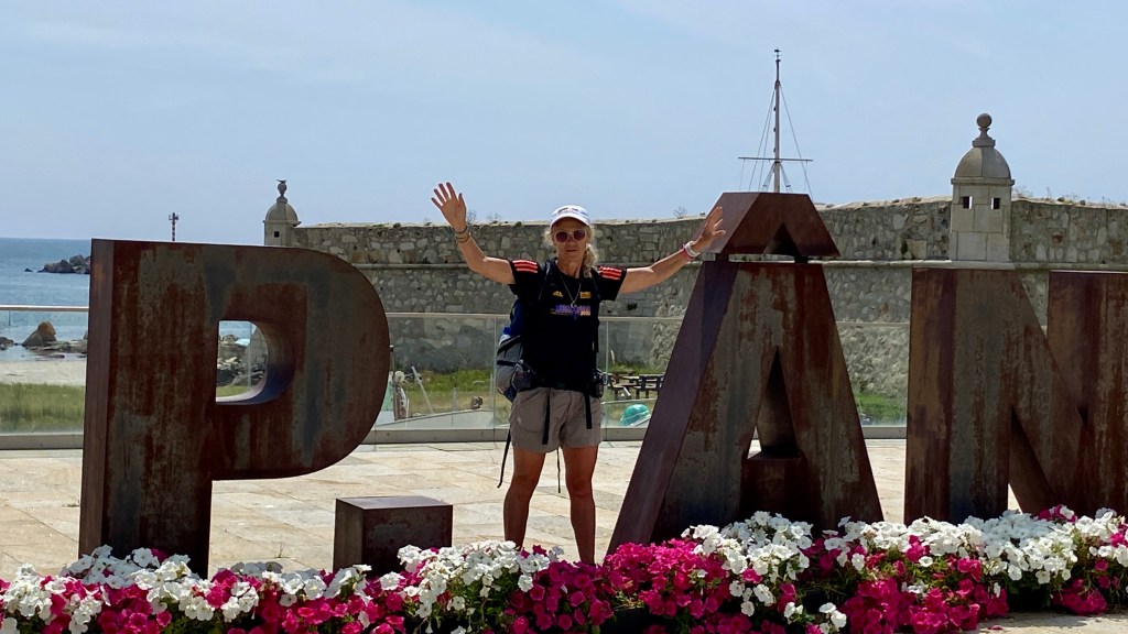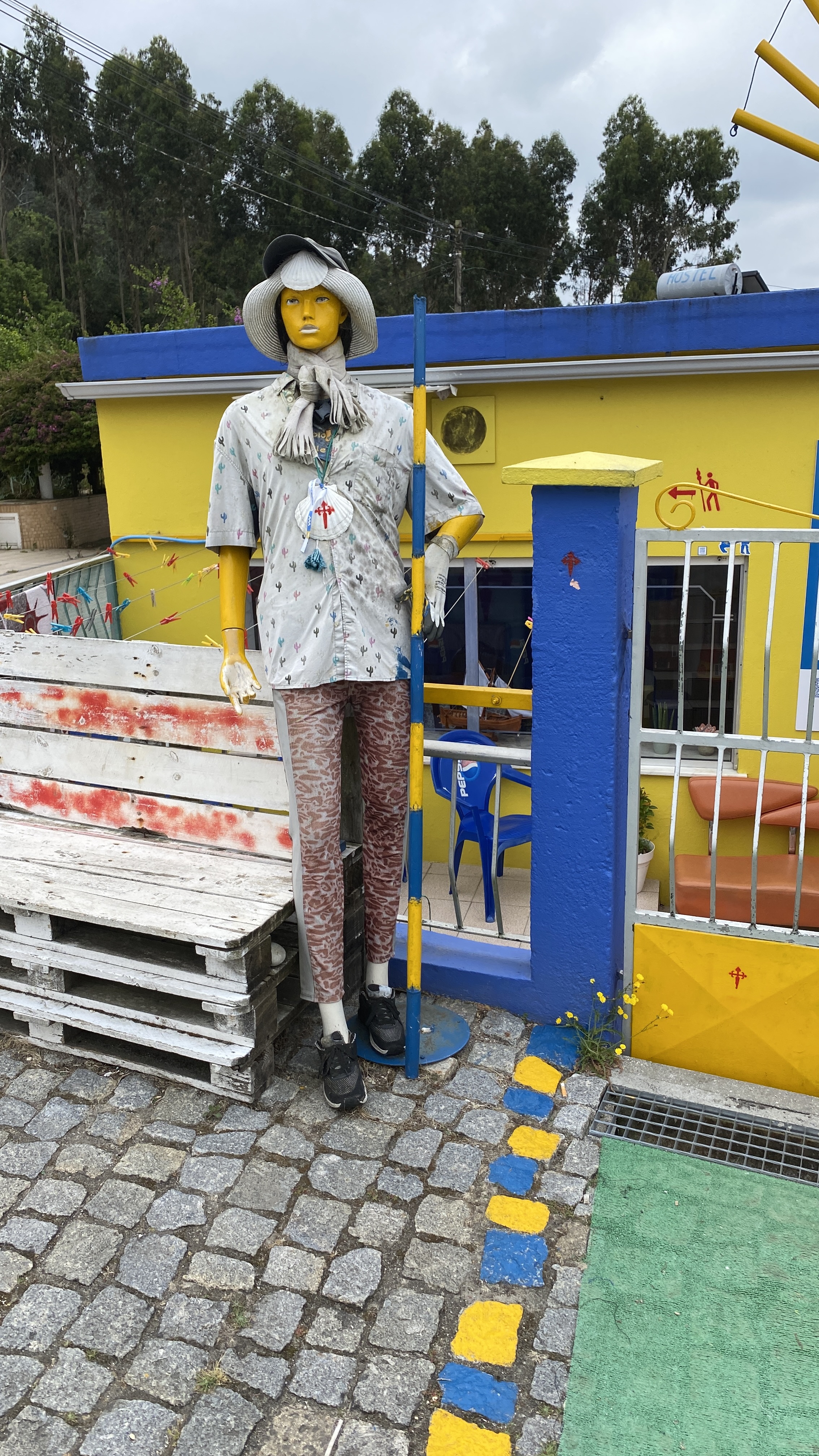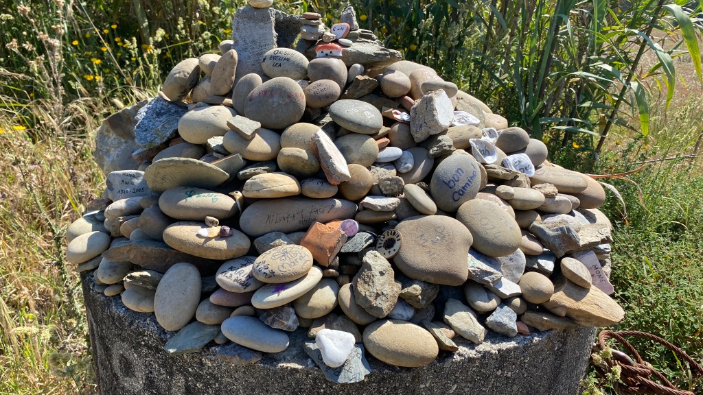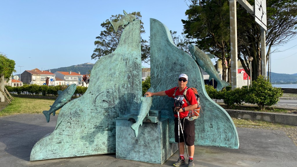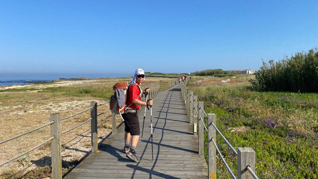 Another day with lots of boardwalks. These eventually lead us away from the coast although it is possible to continue along the water. The more inland route had some shade which we really appreciated. As with previous days we saw fellow pilgrims here and there. We stopped for a bite and discovered a café full of pilgrims. We started to notice that even though we were not passing or being passed by other pilgrims while walking, we saw many every time we stopped. June is not peak season, but we were rarely alone.