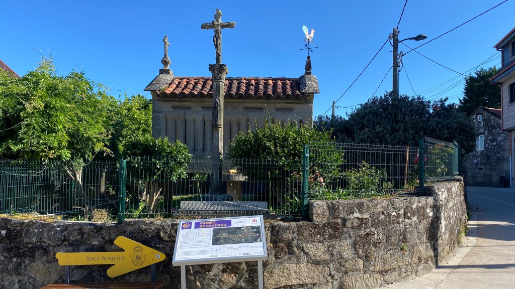 This was another lovely day through the countryside. Padron is probably most famous for the pilling that St. Peter the apostle’s boat was said to be moored on it. You can find it by the church alter. There is a large square in front of the church which is obviously a gathering point for the locals. In the afternoon it was full of elderly gentlemen playing a game we could not quite figure out. We stayed at O Albergue da Meiga. The private rooms may be better, but we stayed in the dorm and it was big and noisey. They had a cafe, but it was only open in the early afternoon and cooking facilities for guests were limited.