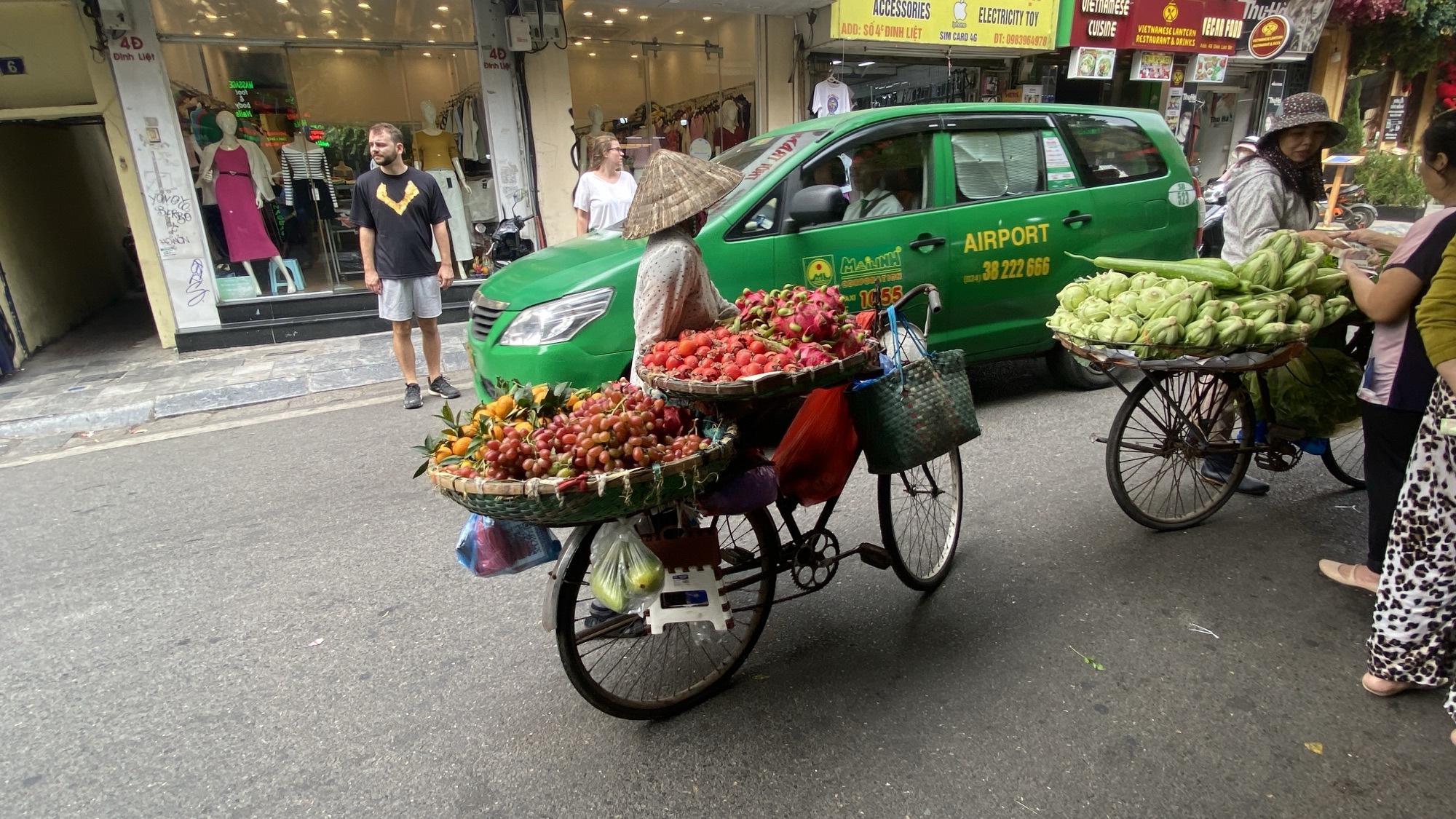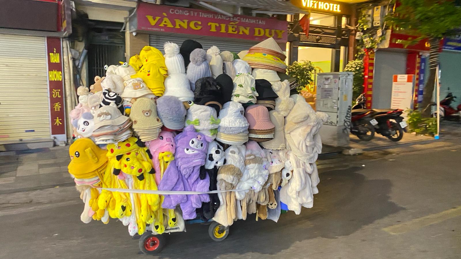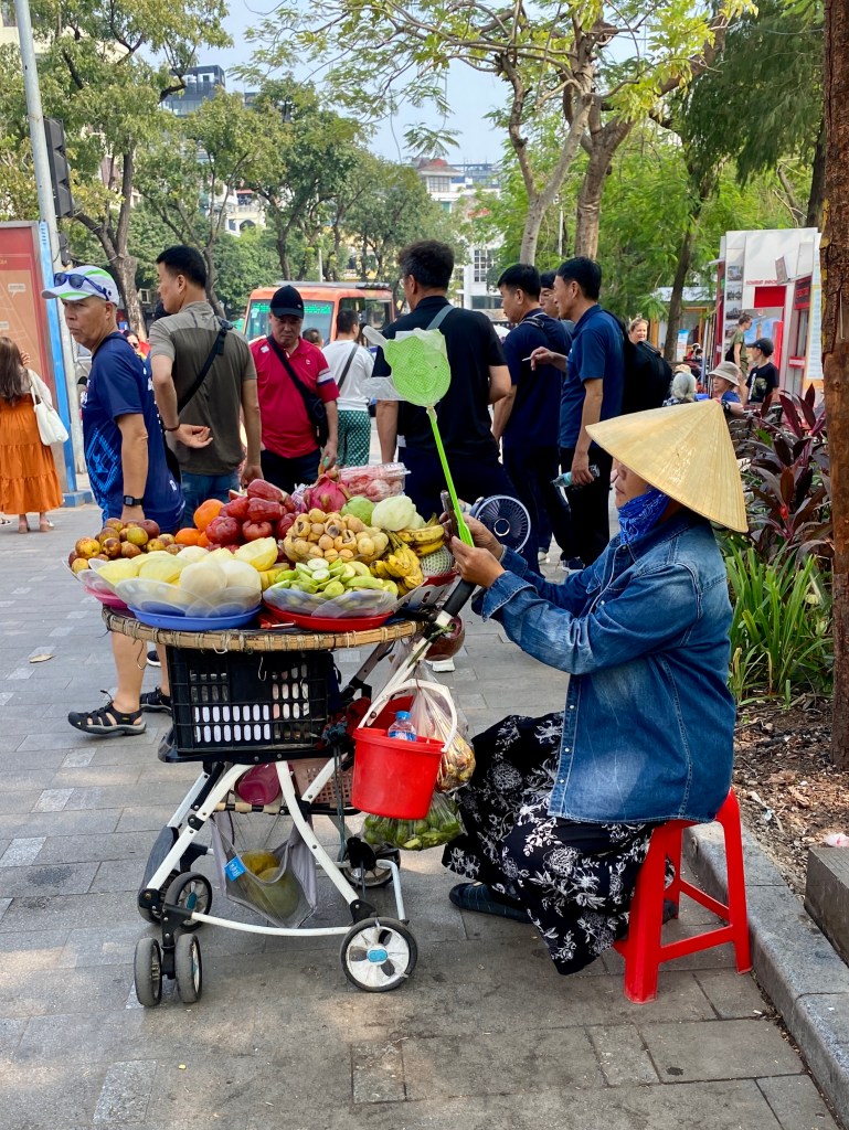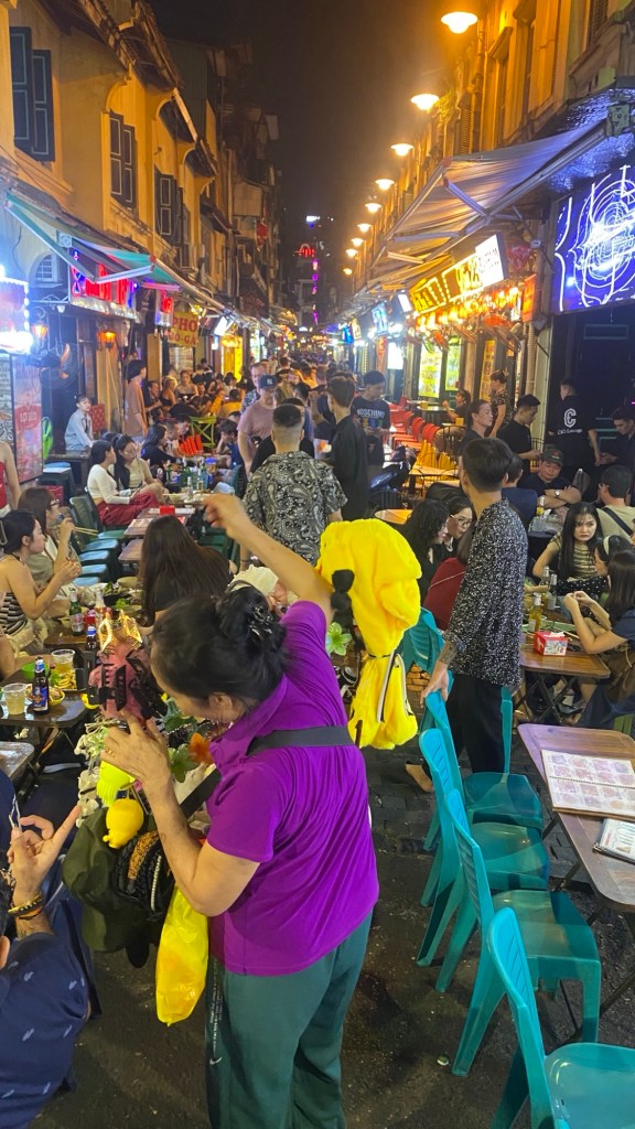 The streets in the old quarter are full of on street and off street bars and restaurants. As the evening goes on the on street restaurants move further and further out onto the street. In theory it’s a car free zone ,but taxis and motorcycles still drive through the crowds. The streets are also full of wandering vendors selling everything from protective covers for iPhones to fried doughnuts to hair accessories. We ate on the street most nights. Beer was around 20,000 VND