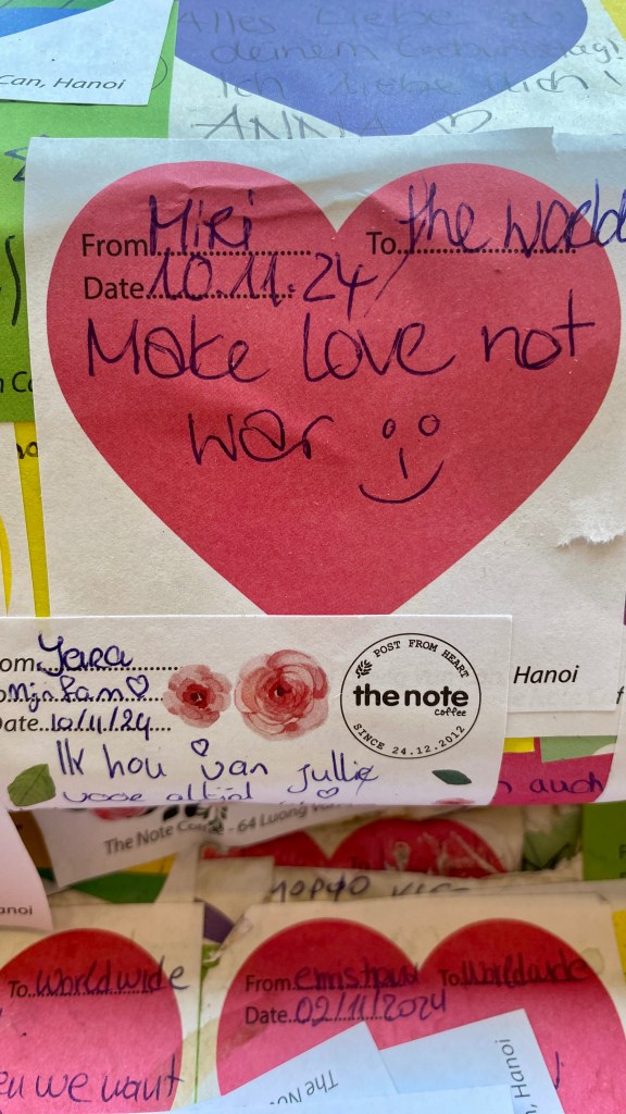 This coffee shop is just off the road around Ho Hoam Kiem. When you buy a drink you get sticky notes which you write messages on and leave anywhere you like in the restaurant.